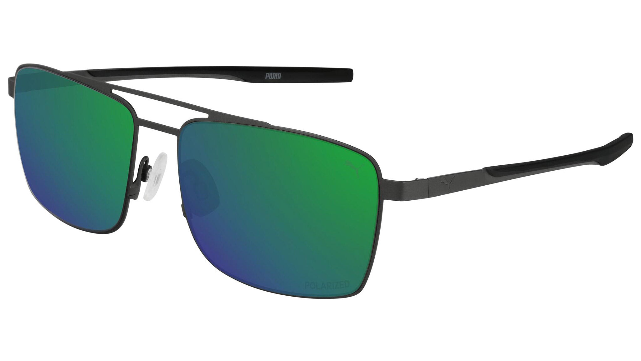 Puma Eyewear model PU0222S 004 matte dark ruthenium Pvd finishing sunglasses, with green lenses. Puma Eyewear merges performance and trends, innovation and fashion, sport and lifestyle, for those who see beyond trends and challenge the norm to move things forward.
