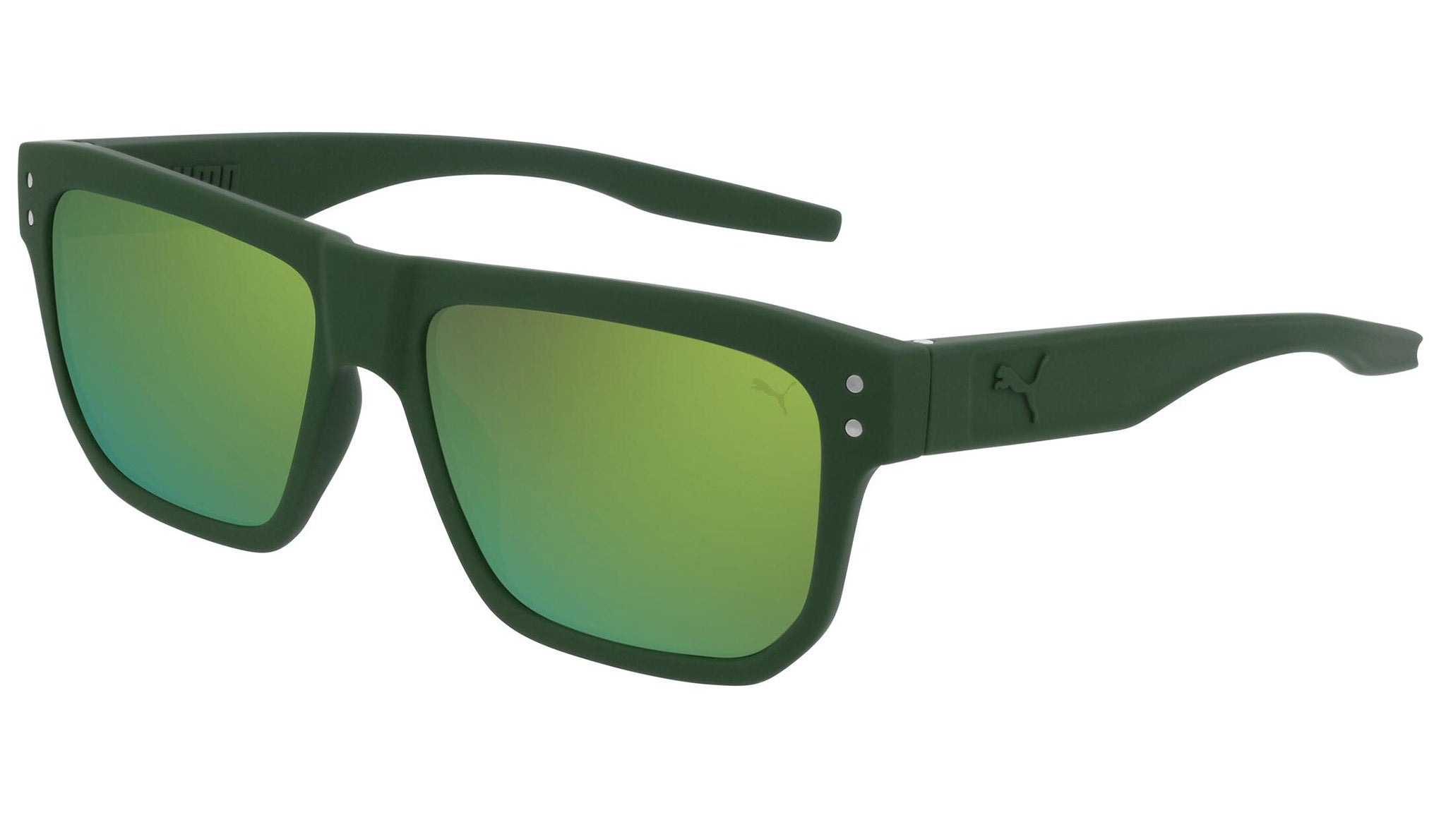 Puma Eyewear model PU0246S 005 solid dark green sunglasses, with green lenses. Puma Eyewear merges performance and trends, innovation and fashion, sport and lifestyle, for those who see beyond trends and challenge the norm to move things forward.