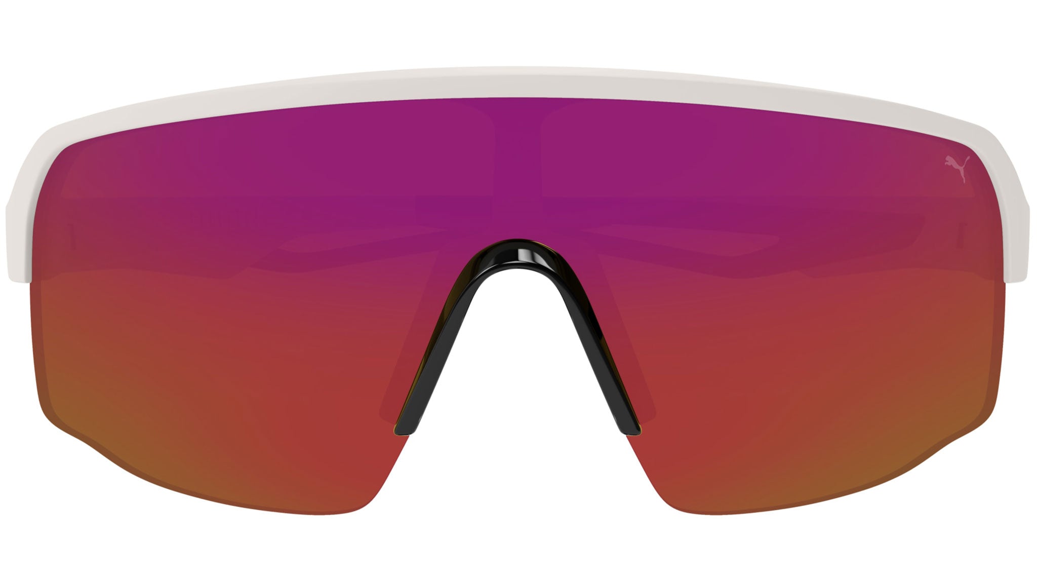 Occhiali da sole Puma Performance modello PU0399SK variante colore 003 bianco grigio opaco tinta unita con lenti color marrone tinta unita specchiato rosso.
