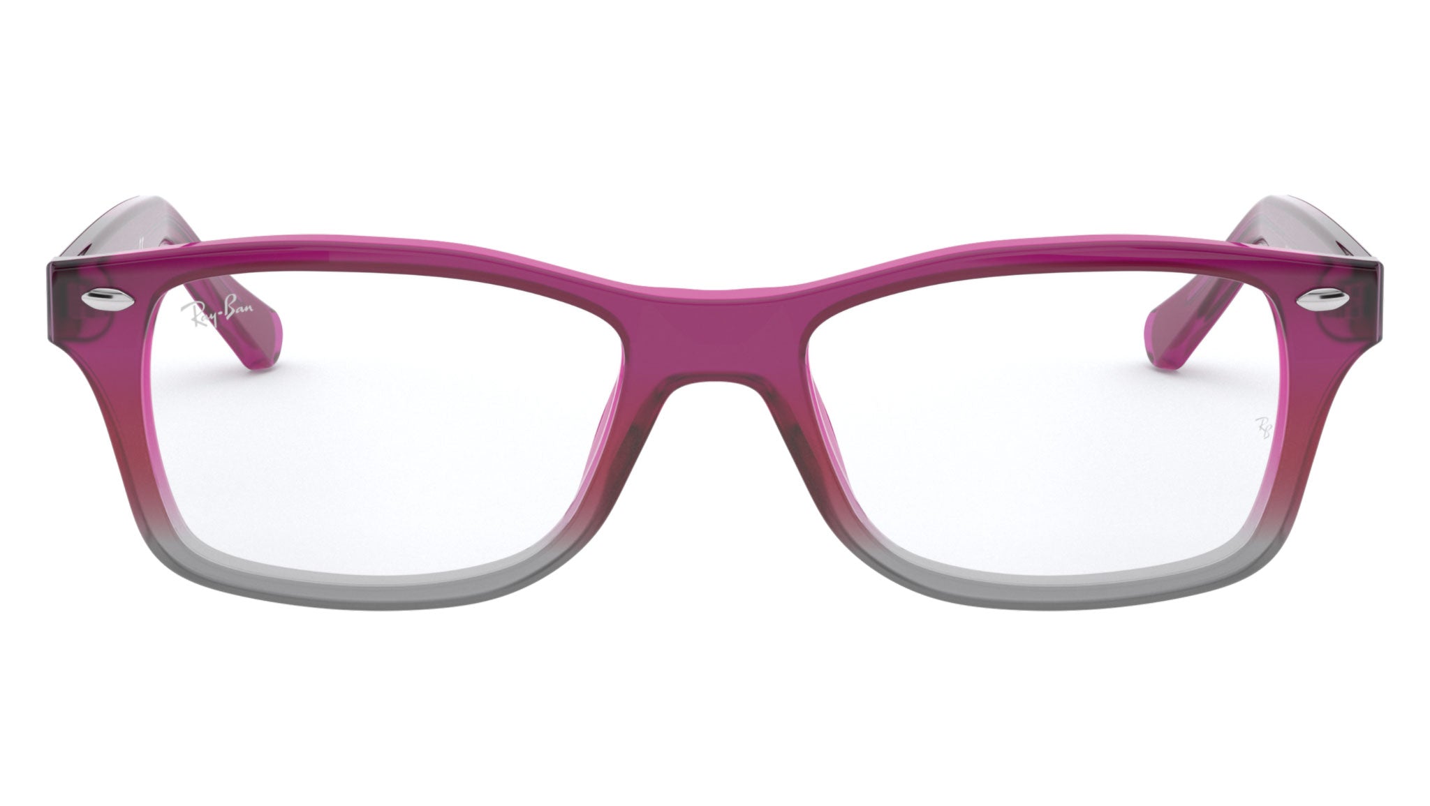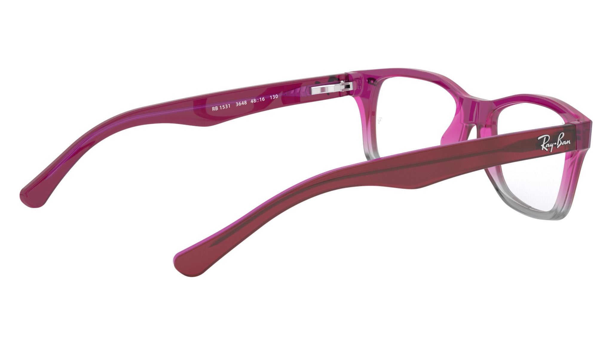 Occhiali da vista Ray-Ban Kids RY1531 color sfumato fuxia grigio iridescente in acetato codice colore 3648. Forma unisex quadrata full rim con lenti demo. Con custodia originale e garanzia. Rivenditore autorizzato Ray-Ban.