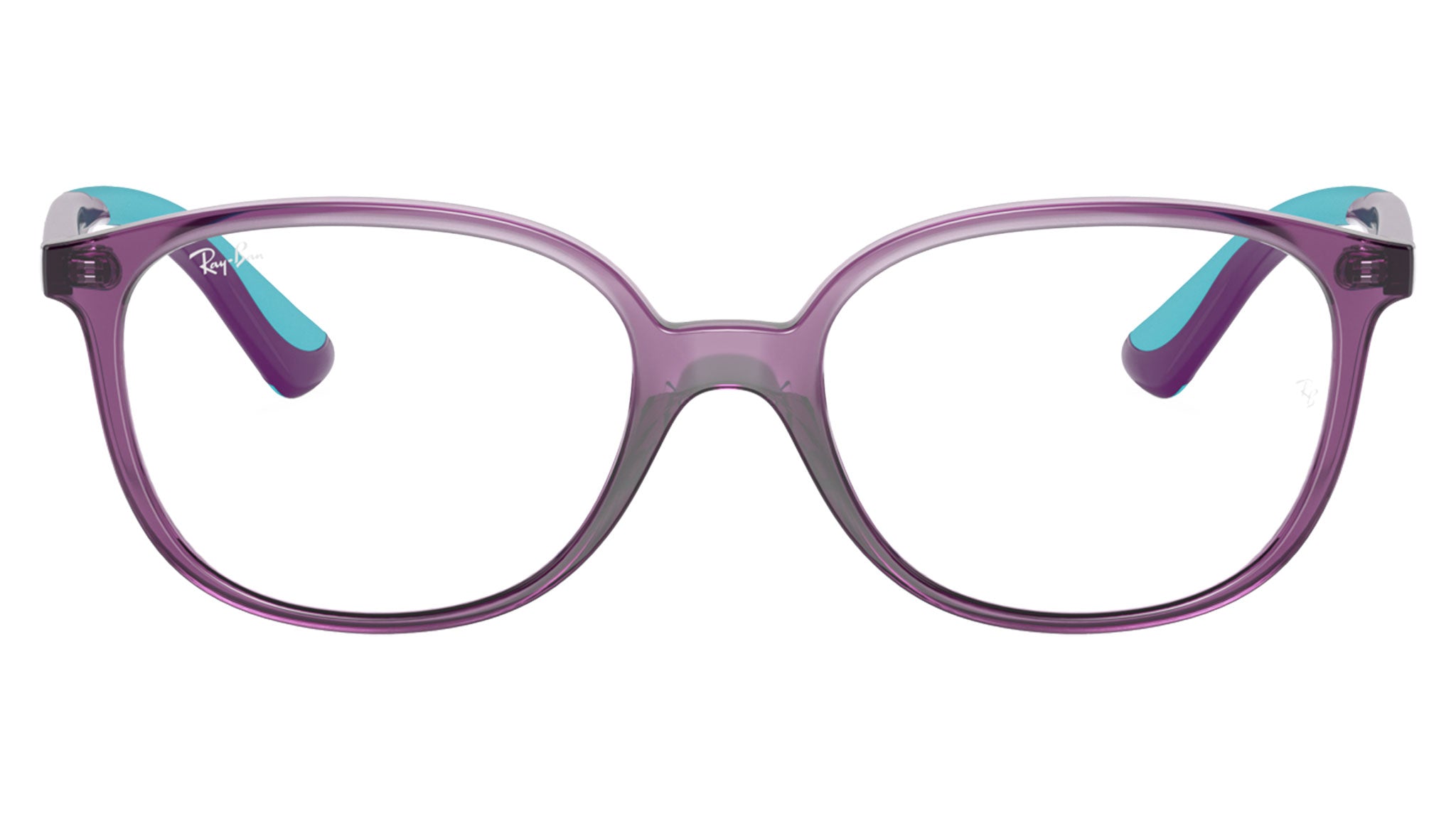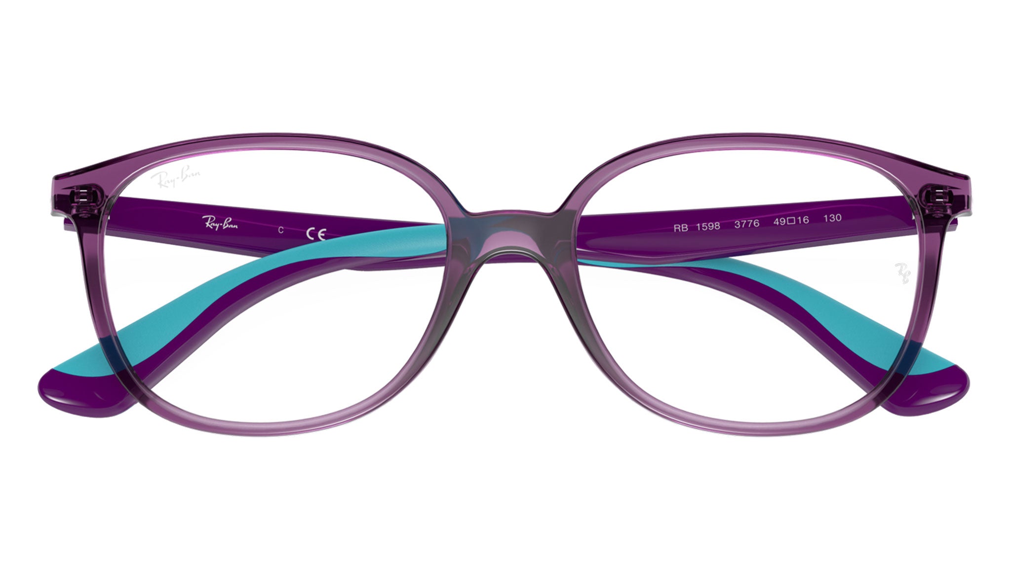 Occhiali da vista Ray-Ban Kids RY1598 color violet trasparente in acetato codice colore 3776. Forma unisex quadrata full rim con lenti demo. Con custodia originale e garanzia. Rivenditore autorizzato Ray-Ban.