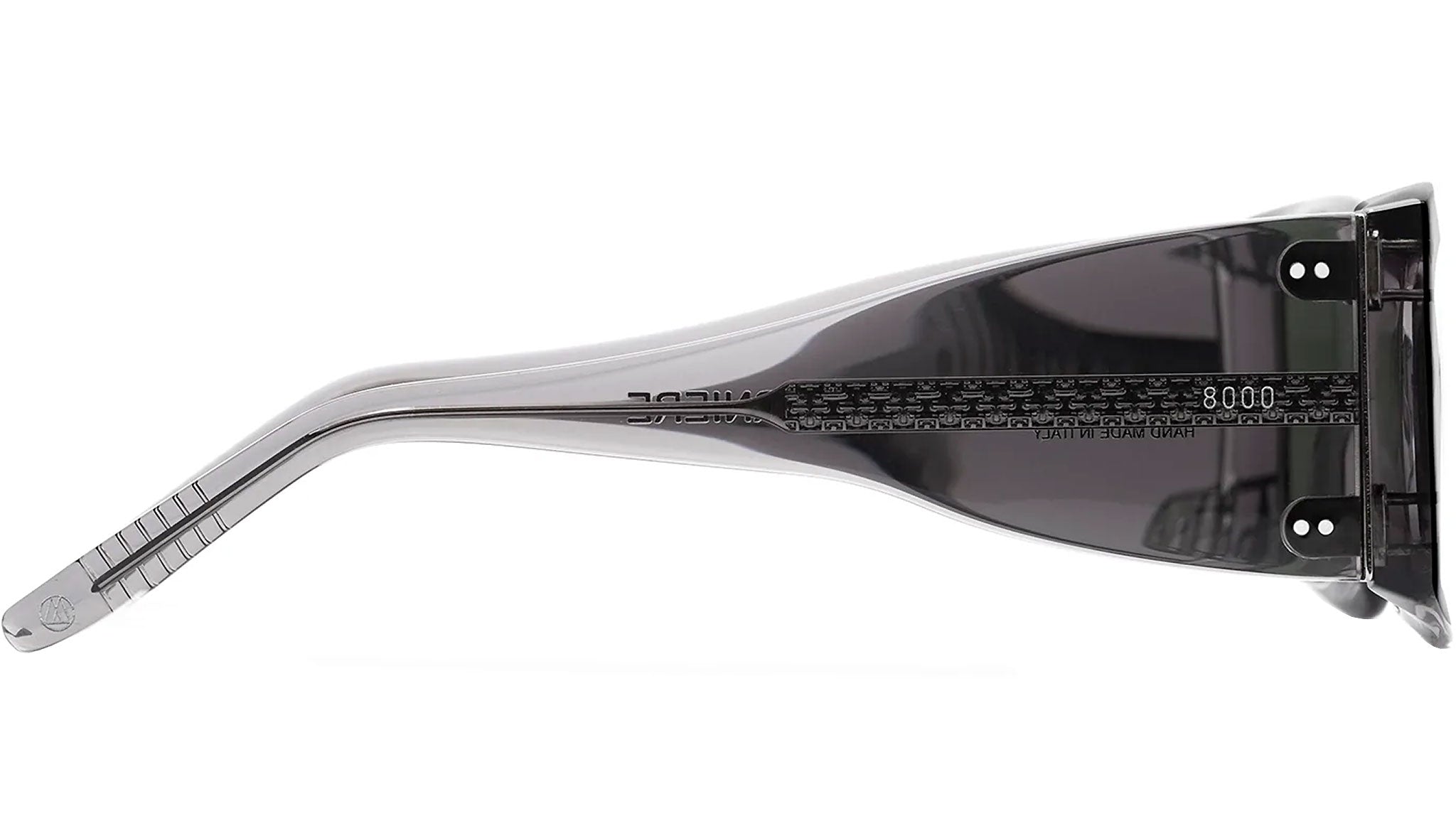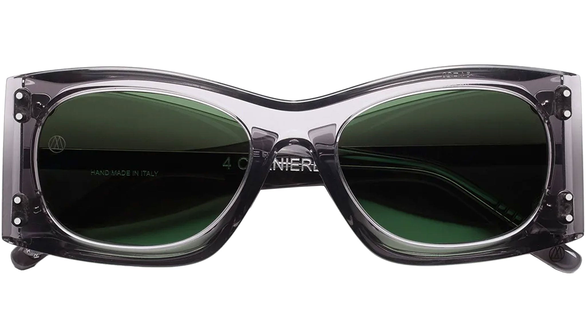 Created for the exclusive Italian-American brand Ottomila, 4 Cerniere is a cutting-edge piece of eyewear that elevates timeless simplicity to iconic contemporary style. 4 Cerniere means 4 hinges in Italian, this unique feature strengthens the structure and allows perfect alignment between the temples and the front of the glasses. The model features wide, squared lenses and chunky acetate rims with geometric temple tips, conceived as a crossover between 1950s glamour and daring masculinity. The model’s sturdy construction has been carved on the inside of the frame, resulting in a high-end piece. This version comes in forest green lenses and grey semi-transparent acetate which allows a glimpse into the metal details inside the temples.