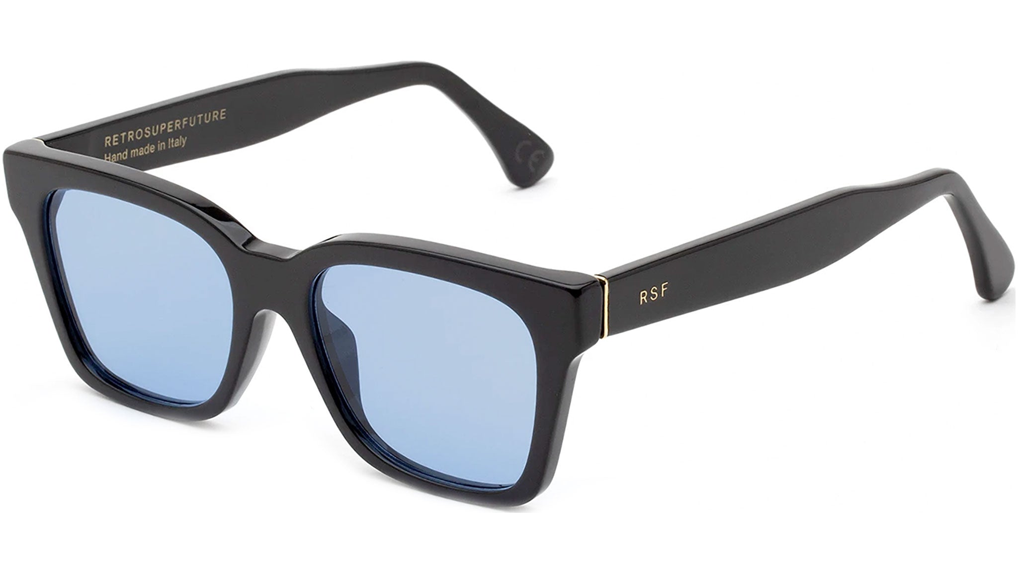 America is an angular, geometric model characterised by thick temple tips, low profile and sturdy arms. Reminiscent of timeless vintage frames, America features wide rectangular lenses and a low nose-bridge. This is a sharp contemporary silhouette inspired by a raw, street sensibility featuring a shiny black acetate and blue lenses. The box contains a semi-hard case and a cleaning cloth.