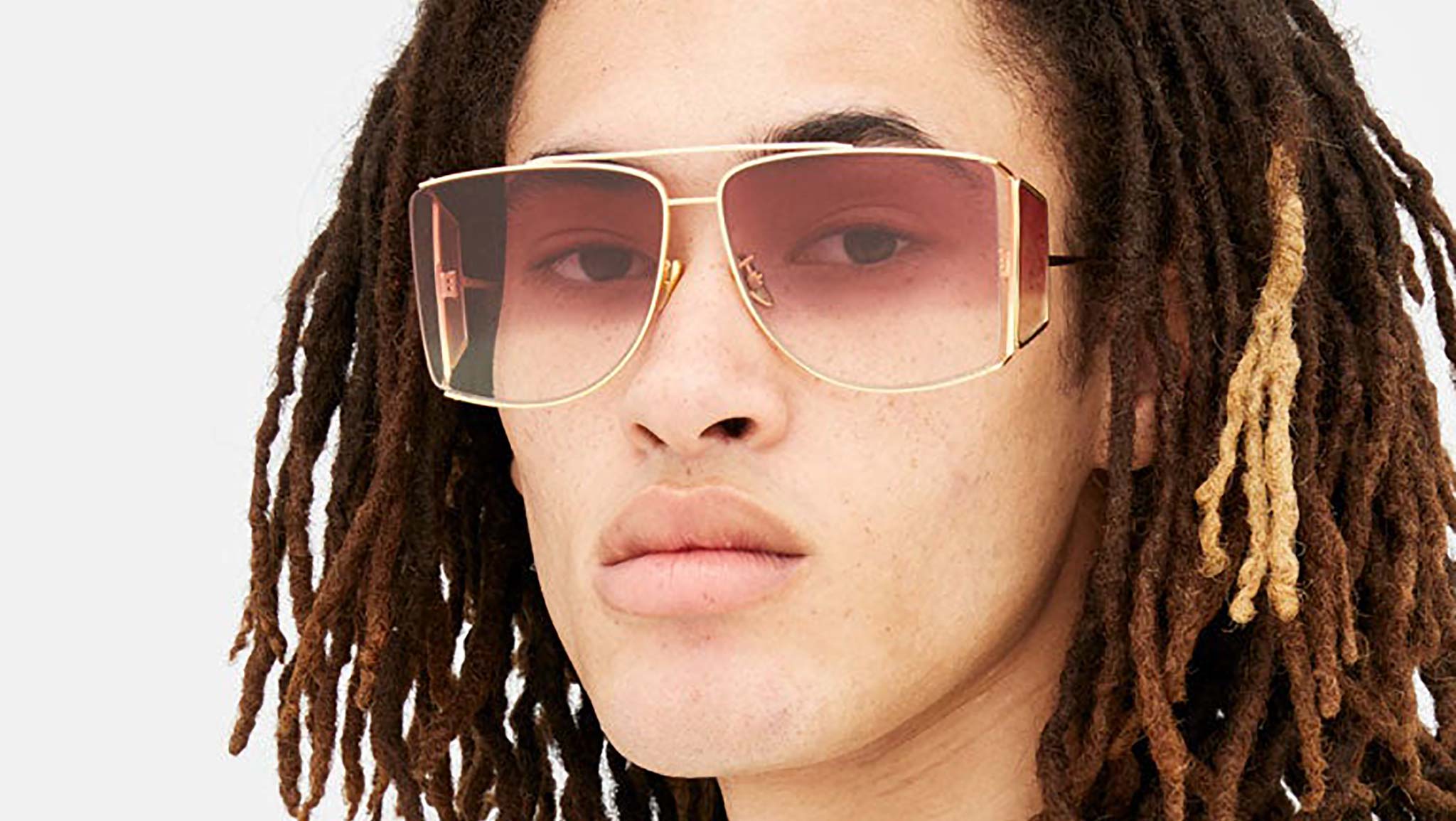 A forward-looking shape, Autore reinvents the classic design of aviator-style frames, adding a whole new dimension with an emphasis on both wearability and cutting-edge style. An all-metal frame, Autore is characterized by a double nose-bridge and light metal rims. The model features a unique lens shape, with a straight edge on the outer line. Oversized metal rims keep the lenses tightly in place, while leaving the edges exposed for a unique, edgy statement. This version features silver rims and tinted red lenses. Sizes: R Lens Width: 63 mm. Frame Front: 146 mm. Frame Side: 140 mm. Product Code Size R: I5O