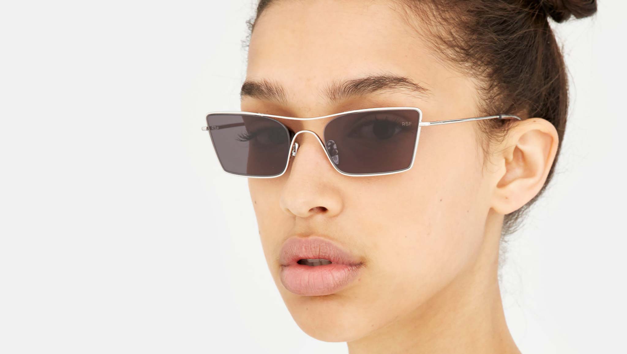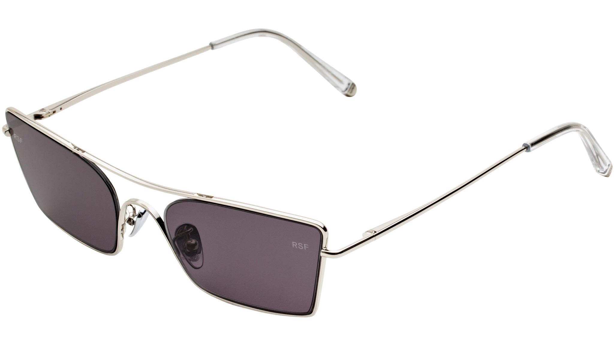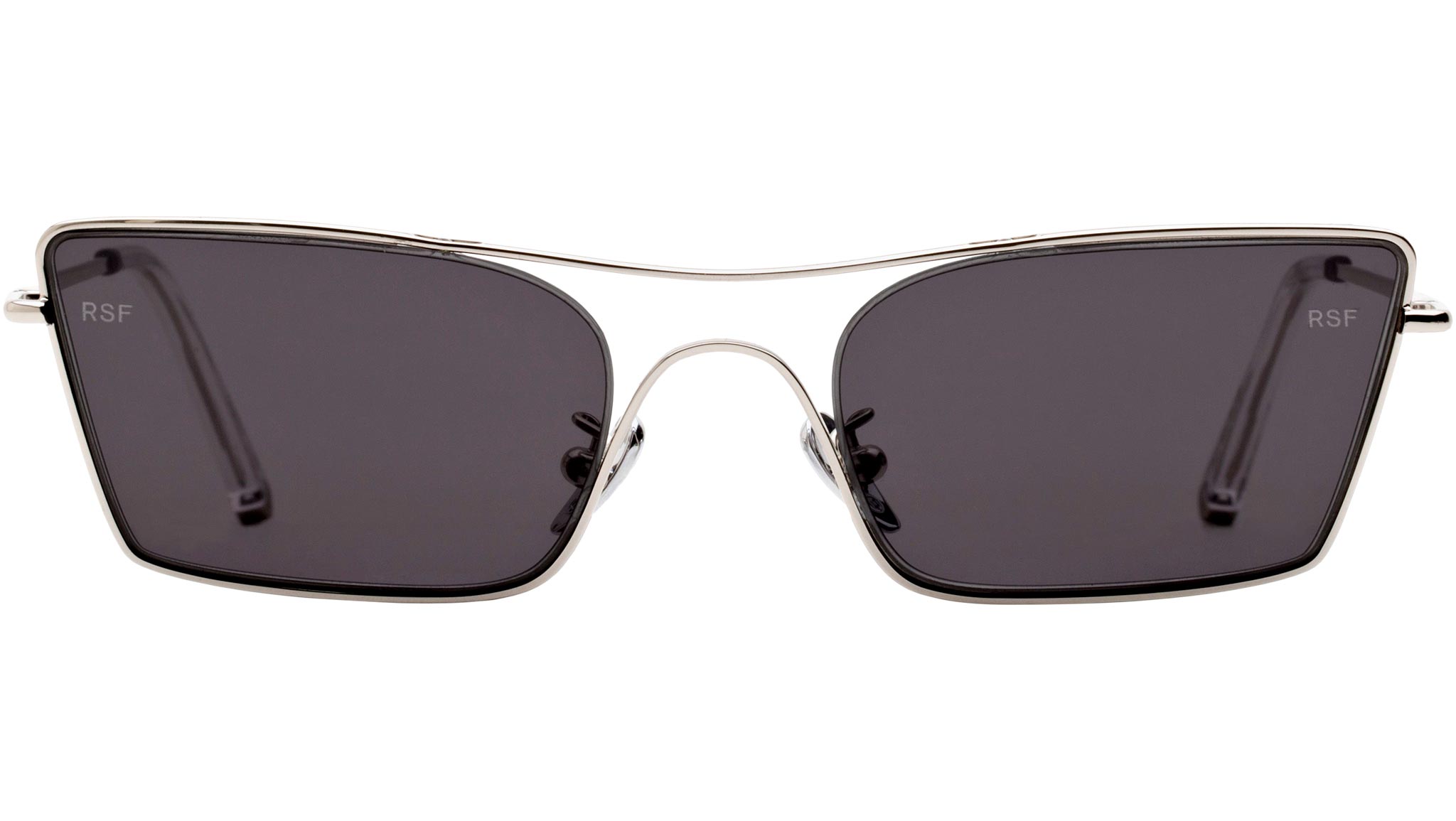 Meta is a sleekall-metal silhouette characterized by aunique construction and streamlinedangular design. The sharp geometric lenses are encapsulated inside the metal frame that circumnavigates and defines the shape. This version of Meta features grey lenses and silver metal finish. The box contains a semi-hard case and a cleaning cloth.