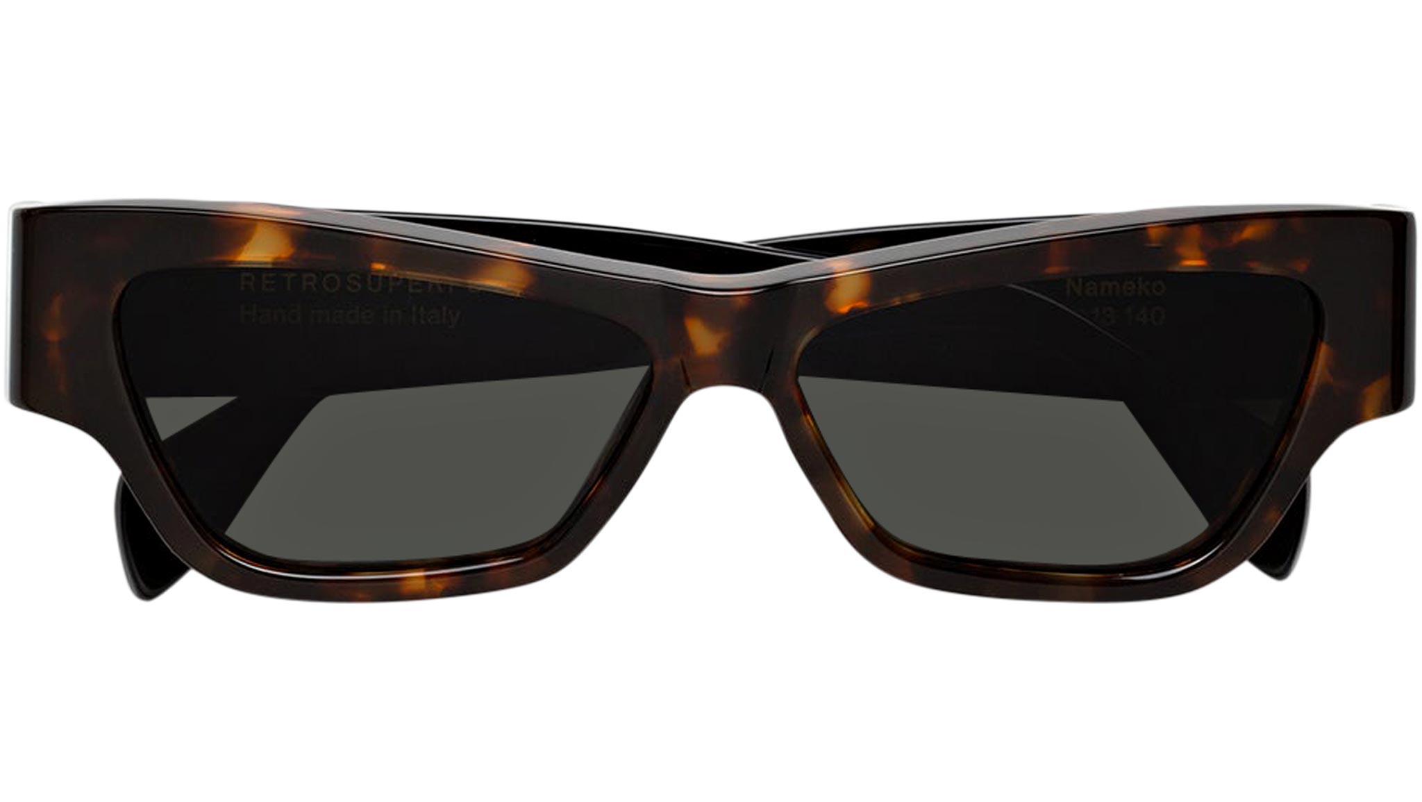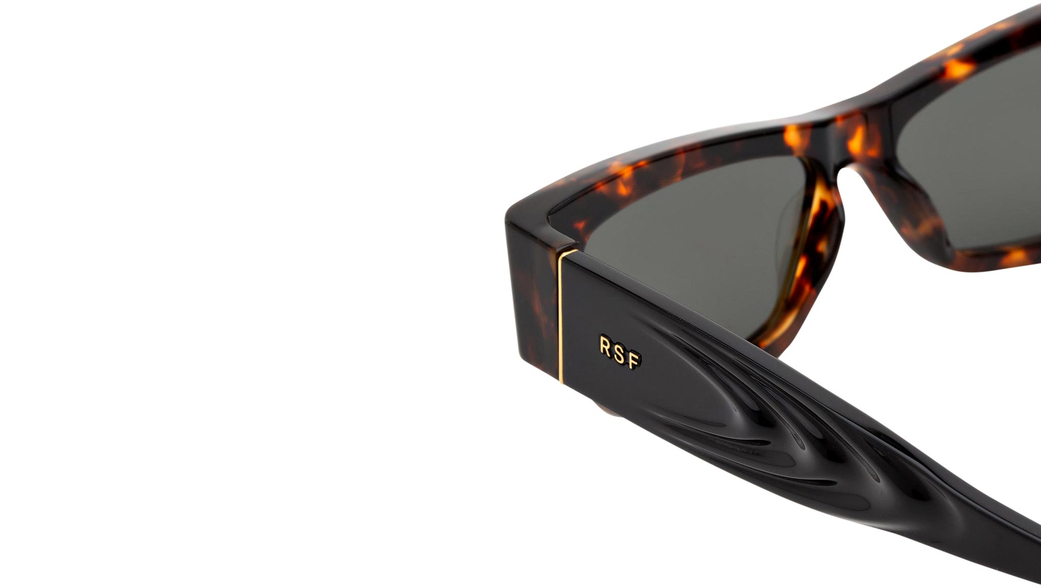 Nameko is an edgy and mischievous eyewear piece that embodies RSF's playful design approach. With a low-riding, wide silhouette, the frame includes a thick brow-line and sturdy geometric frontal frame. The lower half of the frame features slanted, thinner rims. Notably, Nameko stands out with its unique and otherworldly thermoform design on the temples, making it a distinctive and contemporary eyewear piece. This version comes in a rich burnt Havana acetate and black lenses. Sizes: R Lens Width: 56 mm. Frame Front: Frame Side: 140 mm. Product Code Size R: XWN