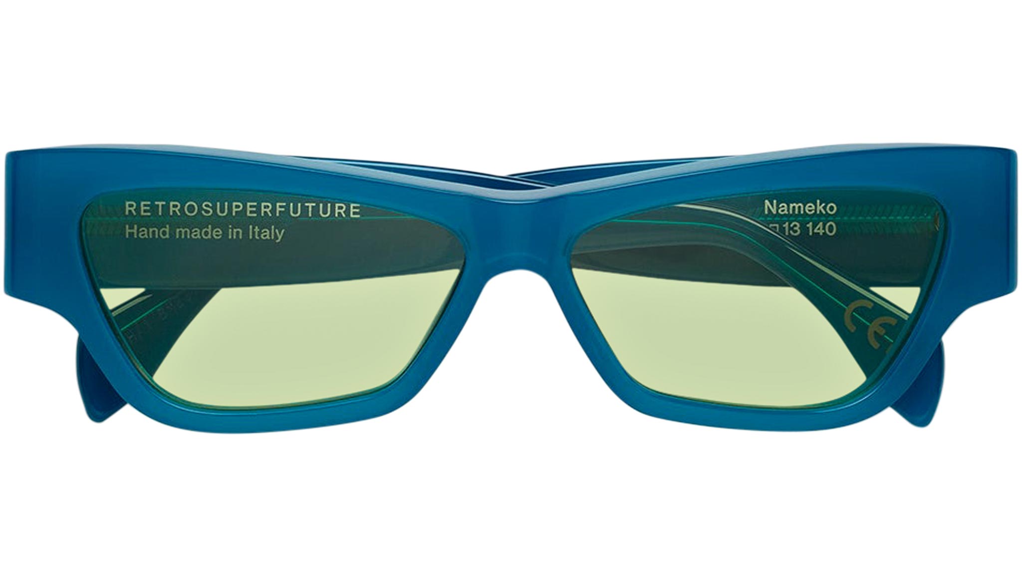 Nameko is an edgy and mischievous eyewear piece that embodies RSF's playful design approach. With a low-riding, wide silhouette, the frame includes a thick brow-line and sturdy geometric frontal frame. The lower half of the frame features slanted, thinner rims. Notably, Nameko stands out with its unique and otherworldly thermoform design on the temples, making it a distinctive and contemporary eyewear piece. This version comes in an opaline blue acetate and acid green lenses. Sizes: R Lens Width: 56 mm. Frame Front: Frame Side: 140 mm. Product Code Size R: 27H