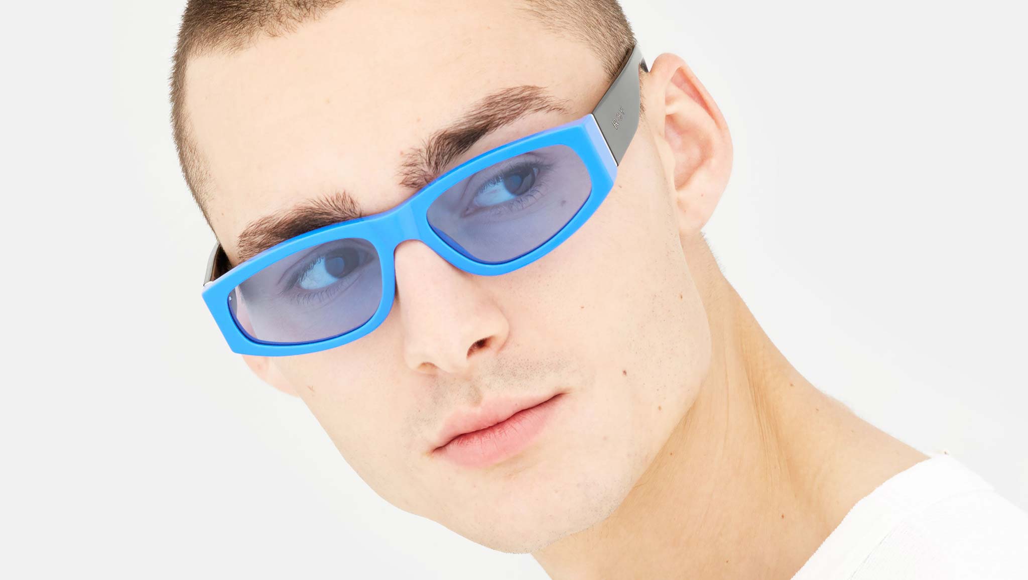 Neema is a streamlinedshape with a sturdy, thick acetatedesign. Characterized by a fast low-riding design, Neema’s sports-inspired shape was carvedto form a mask-like profile with a curved upper line, thick nose-bridge and wide temples. This version of Neema features an electric blue frontal framewith blue tinted lenses and black acetate temples. The box contains a semi-hard case and a cleaning cloth.