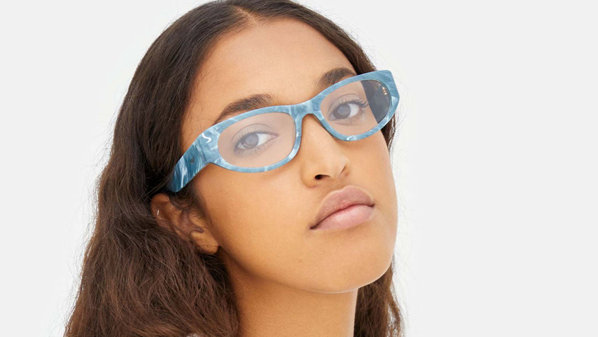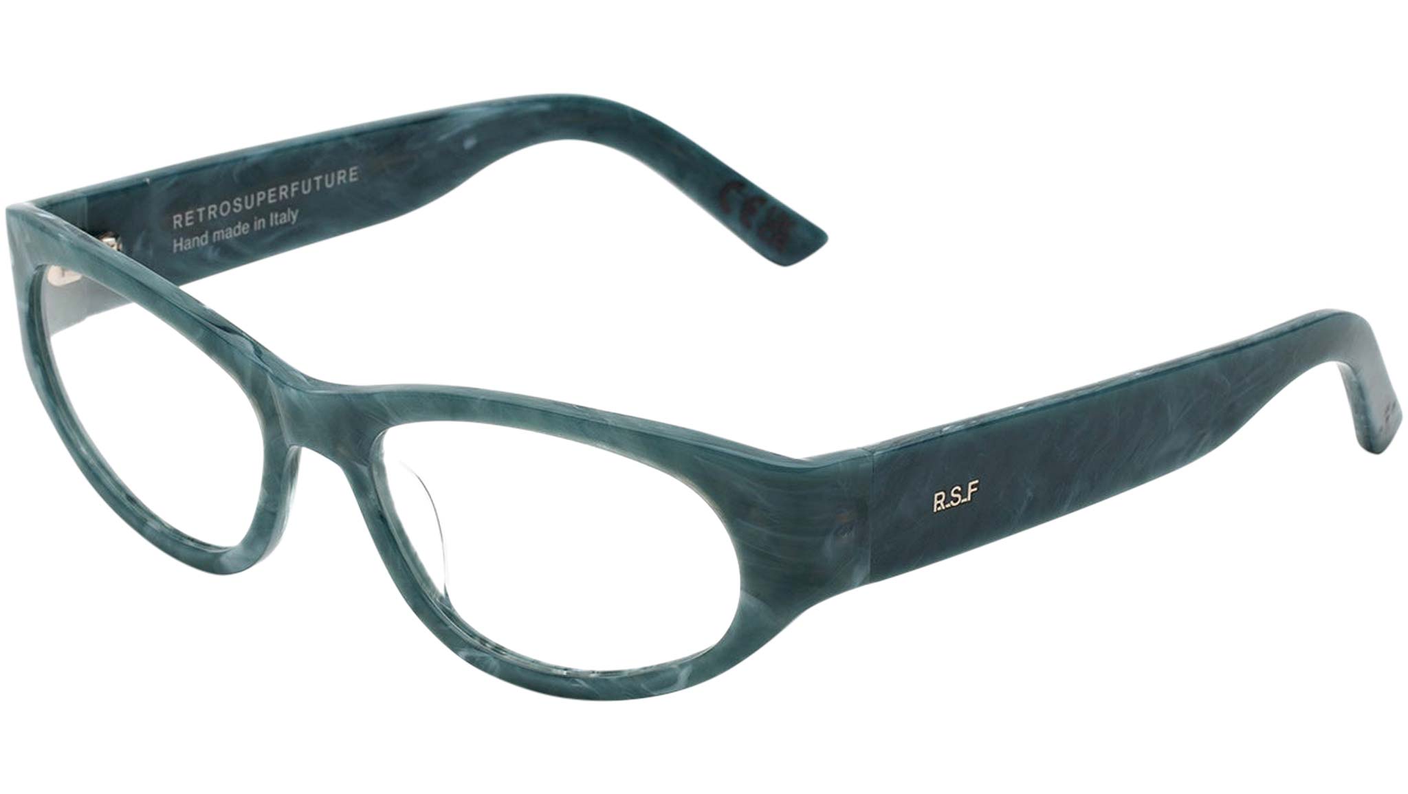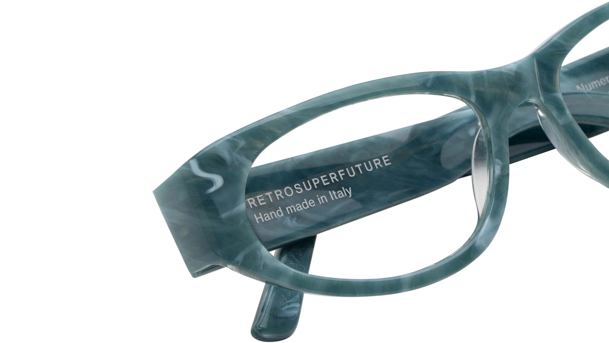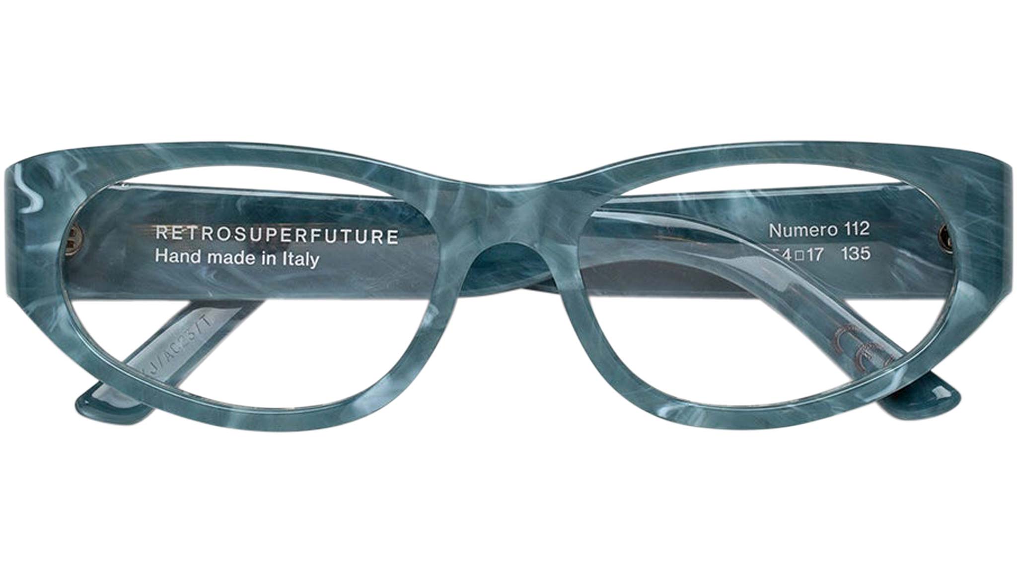 Numero 112 by Retrosuperfuture is an eclectic contemporary frame designed as a crossover between iconic cat-eye shapes and streamlined sportswear pieces. Characterised by a sturdy, compact acetate construction and a slanted profile, Numero 112 features wrap-around temple tips and thick temples. With its bold character and distinctive street edge, Numero 112 redefines everyday eyewear. This is a stand-out RSF Optical silhouette that comes in a turquoise marbled acetate. Sizes: R Lens Width: 54 mm. Frame Front: Frame Side: 135 mm. Product Code Size R: 8XJ