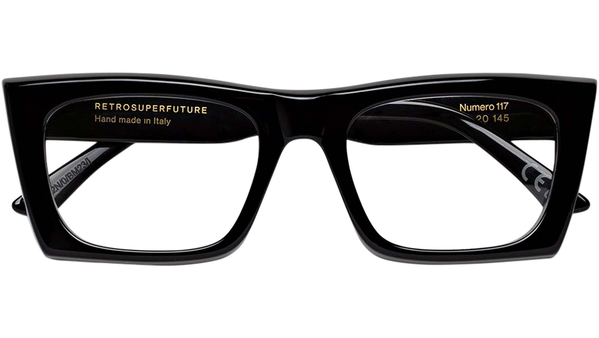 Numero 117 by Retrosuperfuture is an everyday piece of eyewear with character. The model features a sharp, angular profile, with pointy detailing on the temples giving it the characteristic stand-out look it has. A compact, sturdy design, Numero 117 is an elegant yet playful silhouette with a street edge. This model comes in a shiny black acetate that highlights its sharp features. Sizes: R Lens Width: 54 mm. Frame Front: Frame Side: 145 mm. Product Code Size R: R2N