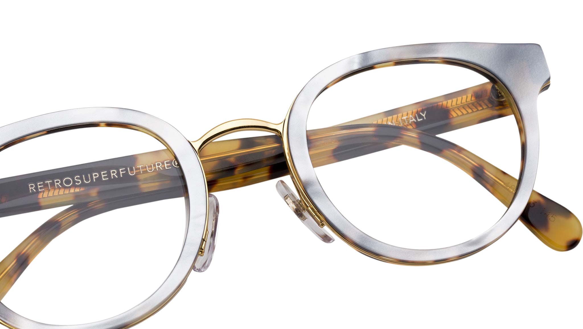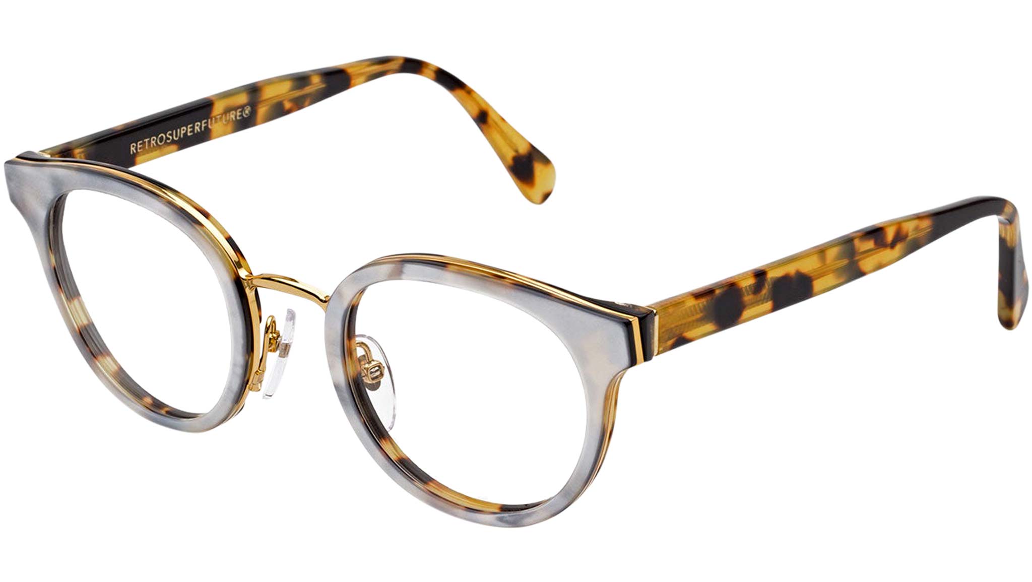 Retrosuperfuture this model presents a rich combination of materials and finishes, without sacrificing lightness and wearability. This rounded frame is composed of three different layers of material—a metallic core, ivory and havana acetates—that are thin yet add sturdiness to the frame. Prescription lenses not included.