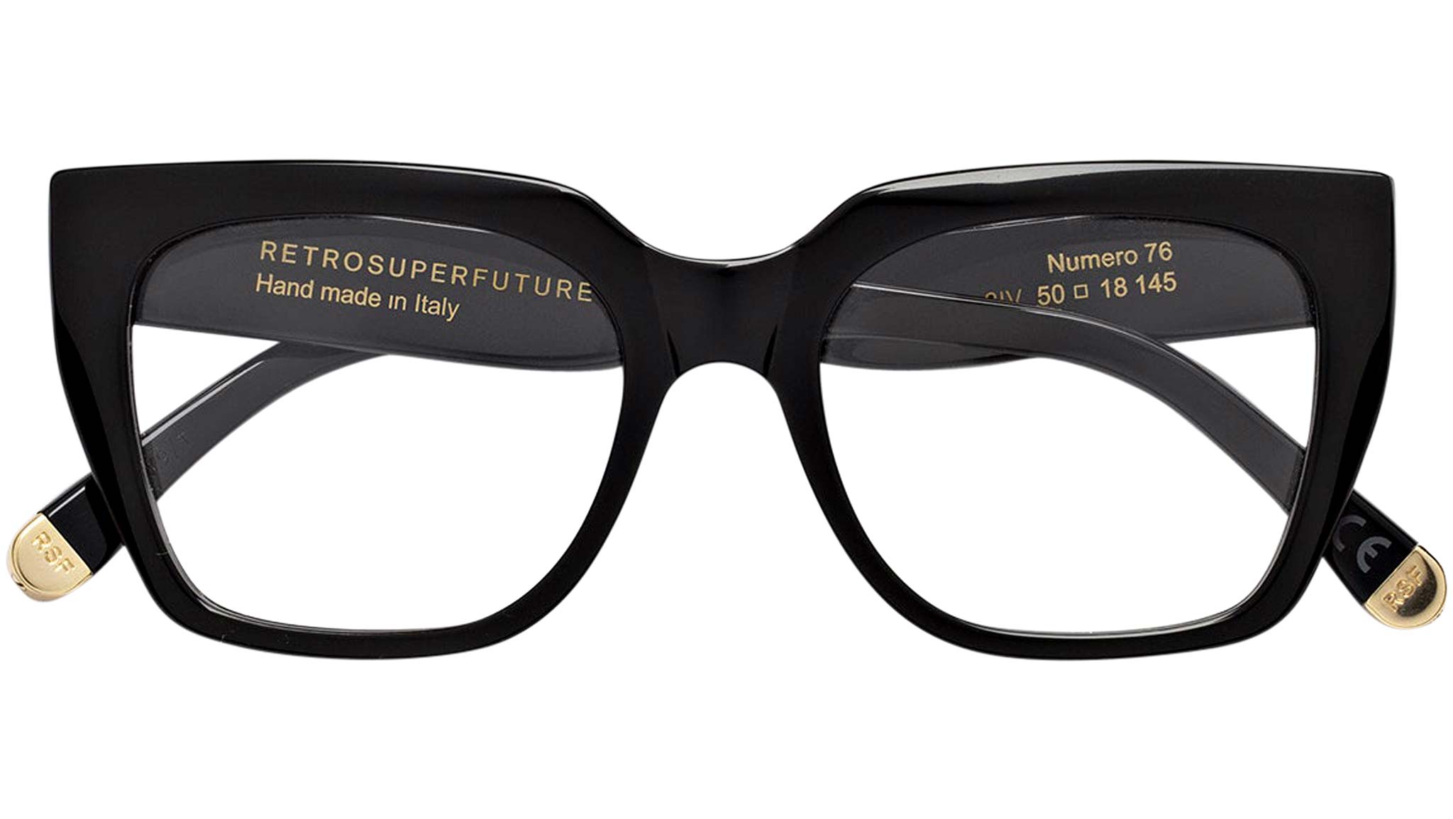 An everyday frame with a bold design, Numero 76 is an oversized silhouette interpreted with a contemporary aesthetic. The design features squared lenses and sleek acetate rims, carving on the frontal frame and around the edges to highlight its curves, decrease weight and ad extra comfort. This version comes in black acetate. Prescription lenses not included. The box contains a hard case and a cleaning cloth. Sizes: R Lens Width: 50 mm. Frame Front: 146 mm. Frame Side: 145 mm. Product Code Size R: 2IV
