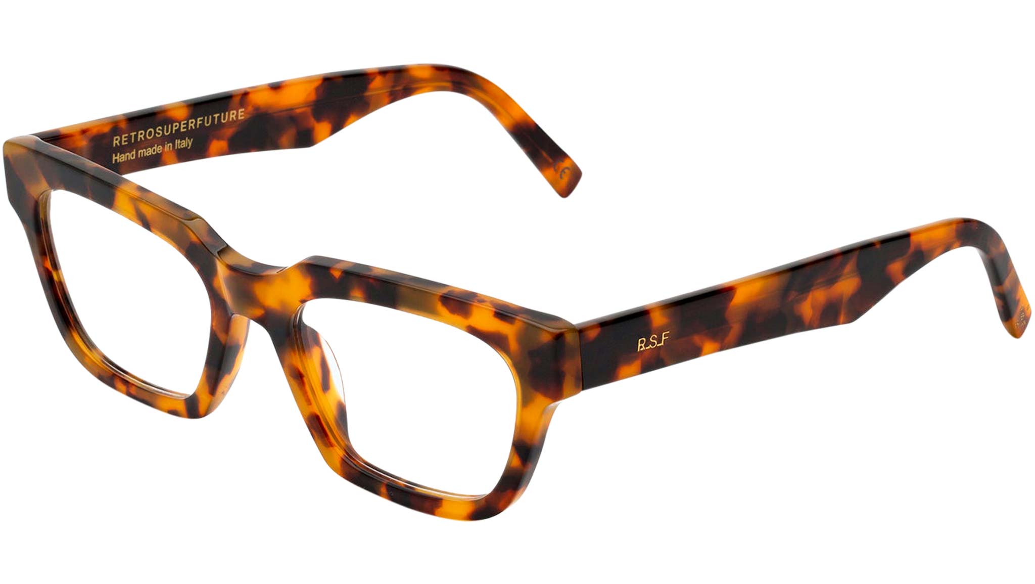 Numero 90 by Retrosuperfuture is an edgy contemporary silhouette with a horizontal, wide shape. Squared lenses with slanted carved rims for lightness, thick acetate brow-line and angular temple tips, highlight its distinctive character. This version comes in warm spotted Havana acetate. Prescription lenses not included. Sizes: R Lens Width: 52 mm. Frame Front: 146 mm. Frame Side: 145 mm. Product Code Size R: 1E7