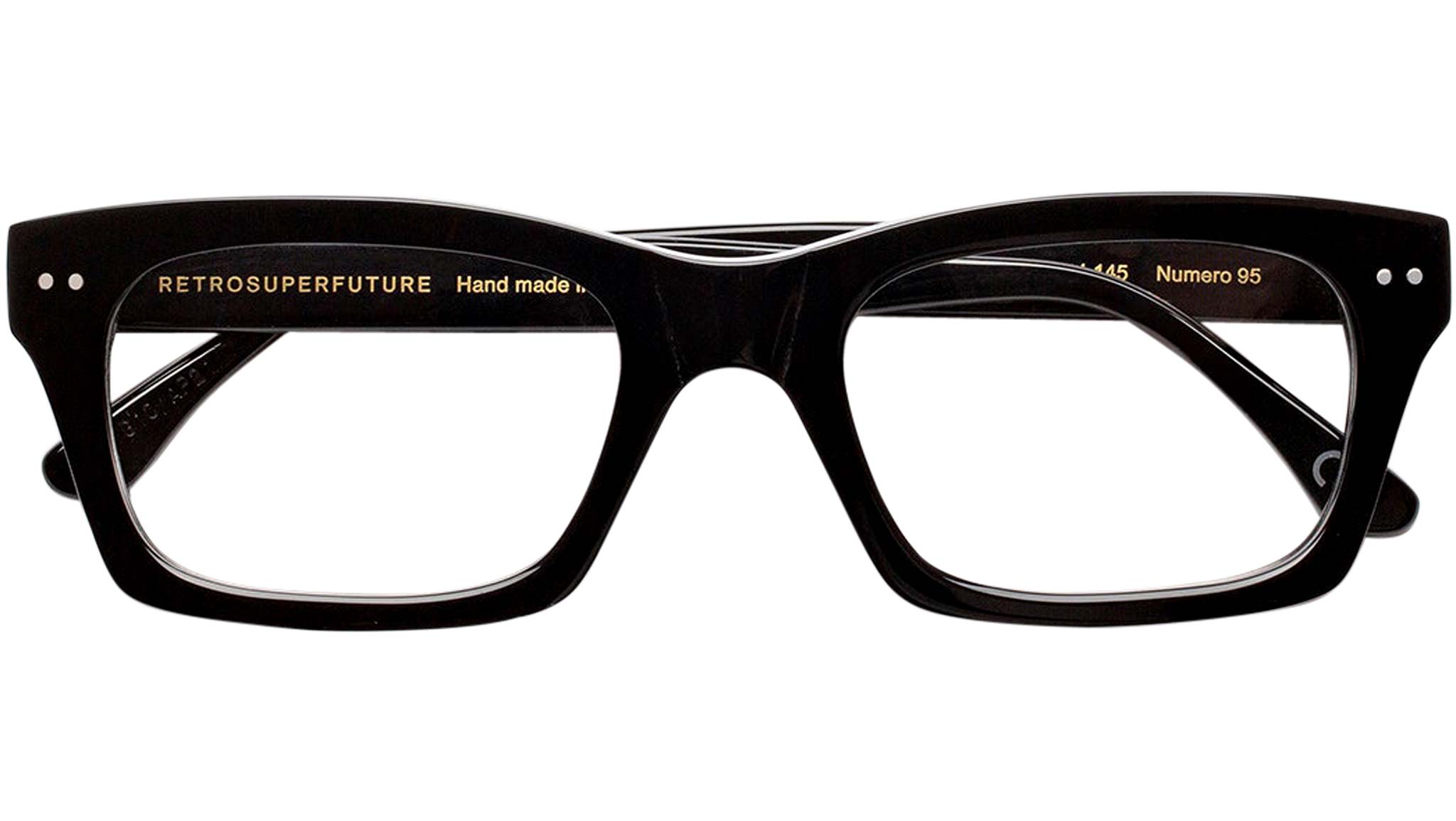 Numero 95 by Retrosuperfuture is an essential piece of eyewear conceived as an everyday staple, yet with a distinct street edge. Its carefully carved solid frame, features a comfortable nose saddle and sturdy acetate rims allows this shape to be well suited both for more formal everyday style as well as a casual urban approach. This model comes in a shiny black acetate. Sizes: R Lens Width: 52 mm. Frame Front: Frame Side: 145 mm. Product Code Size R: G1O