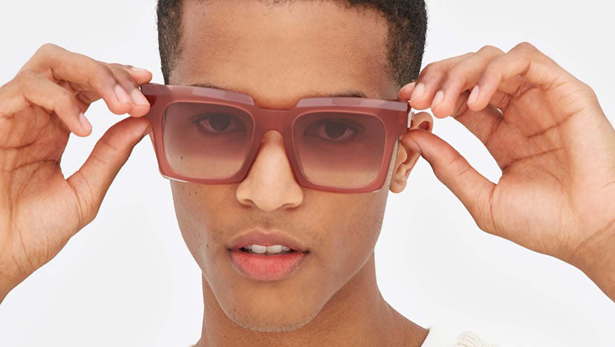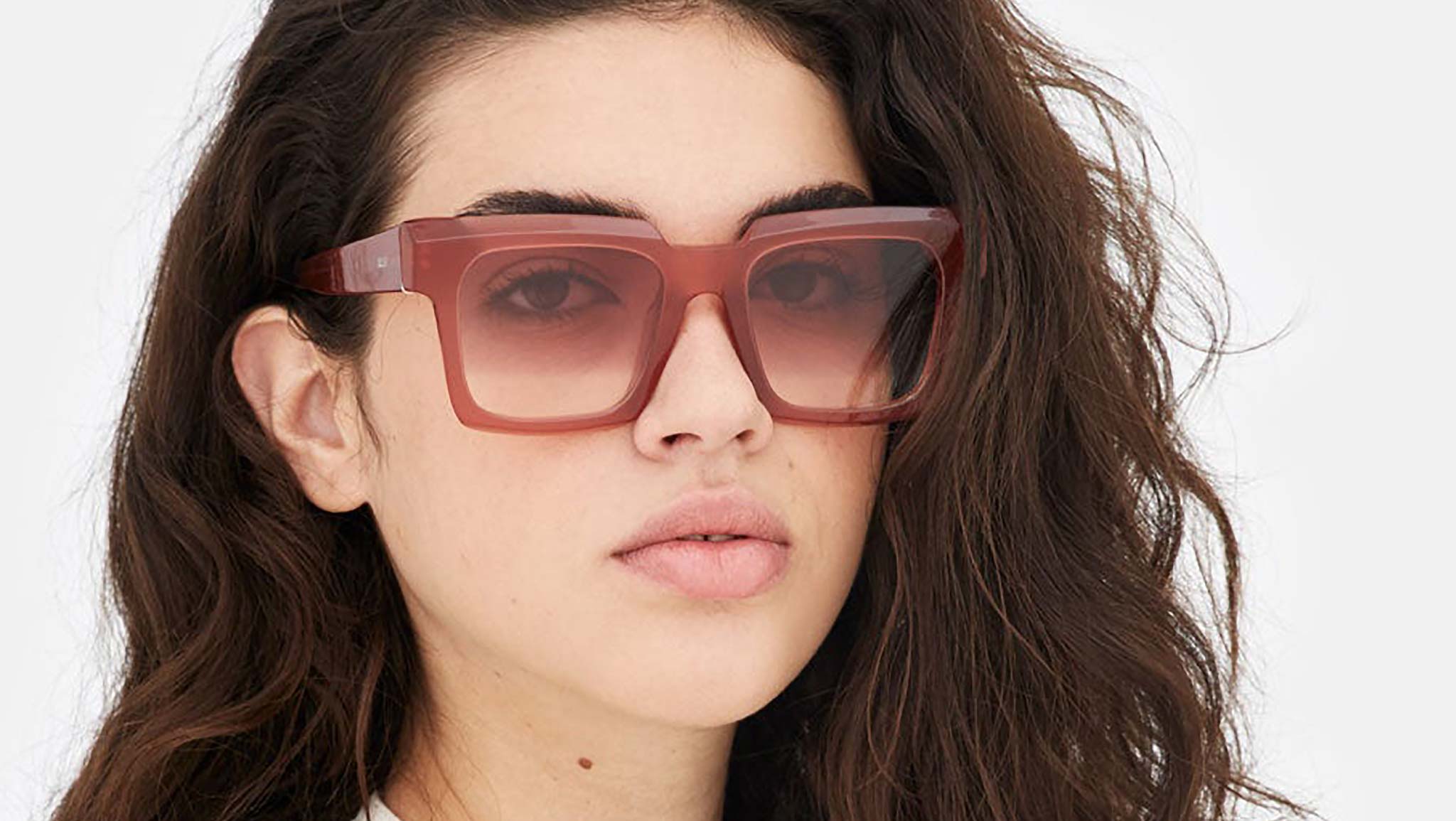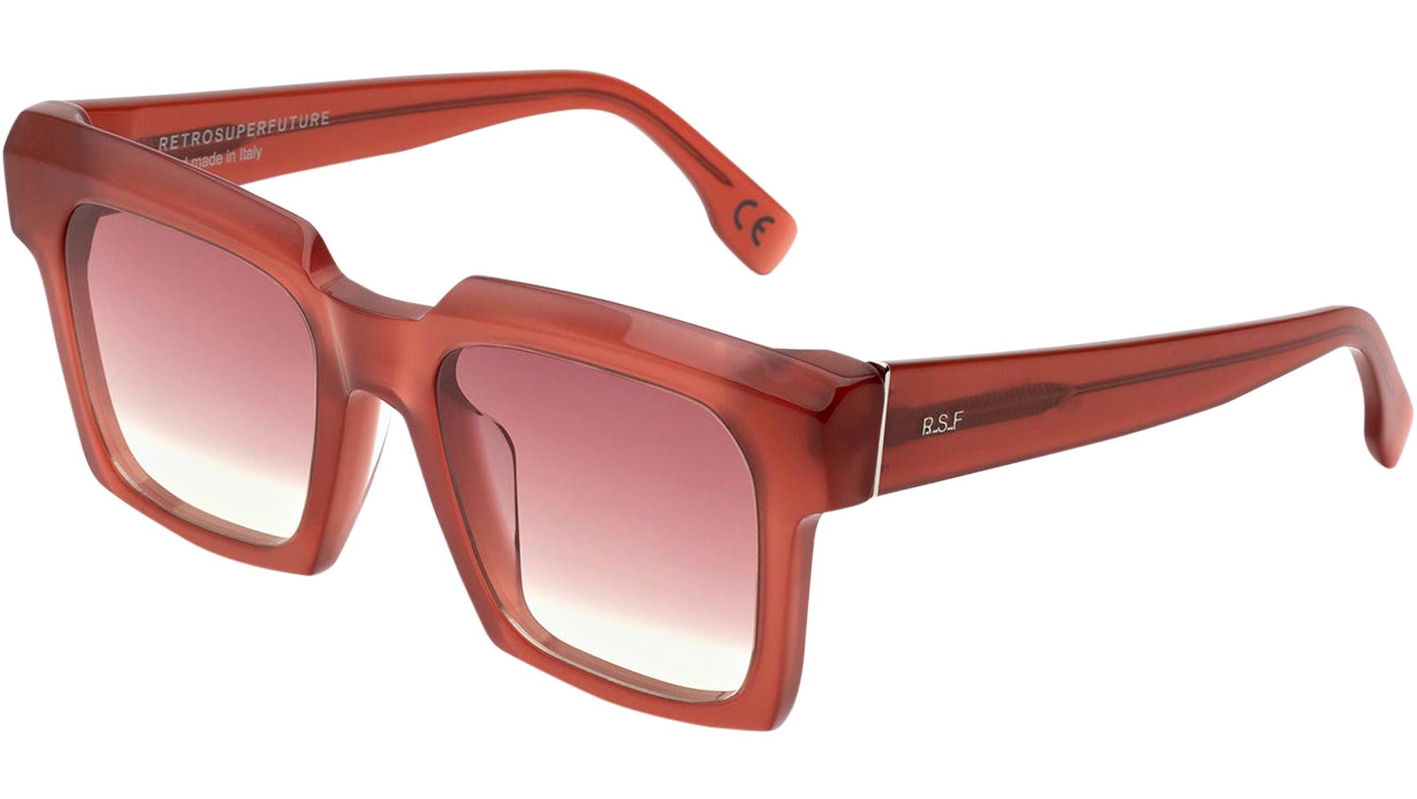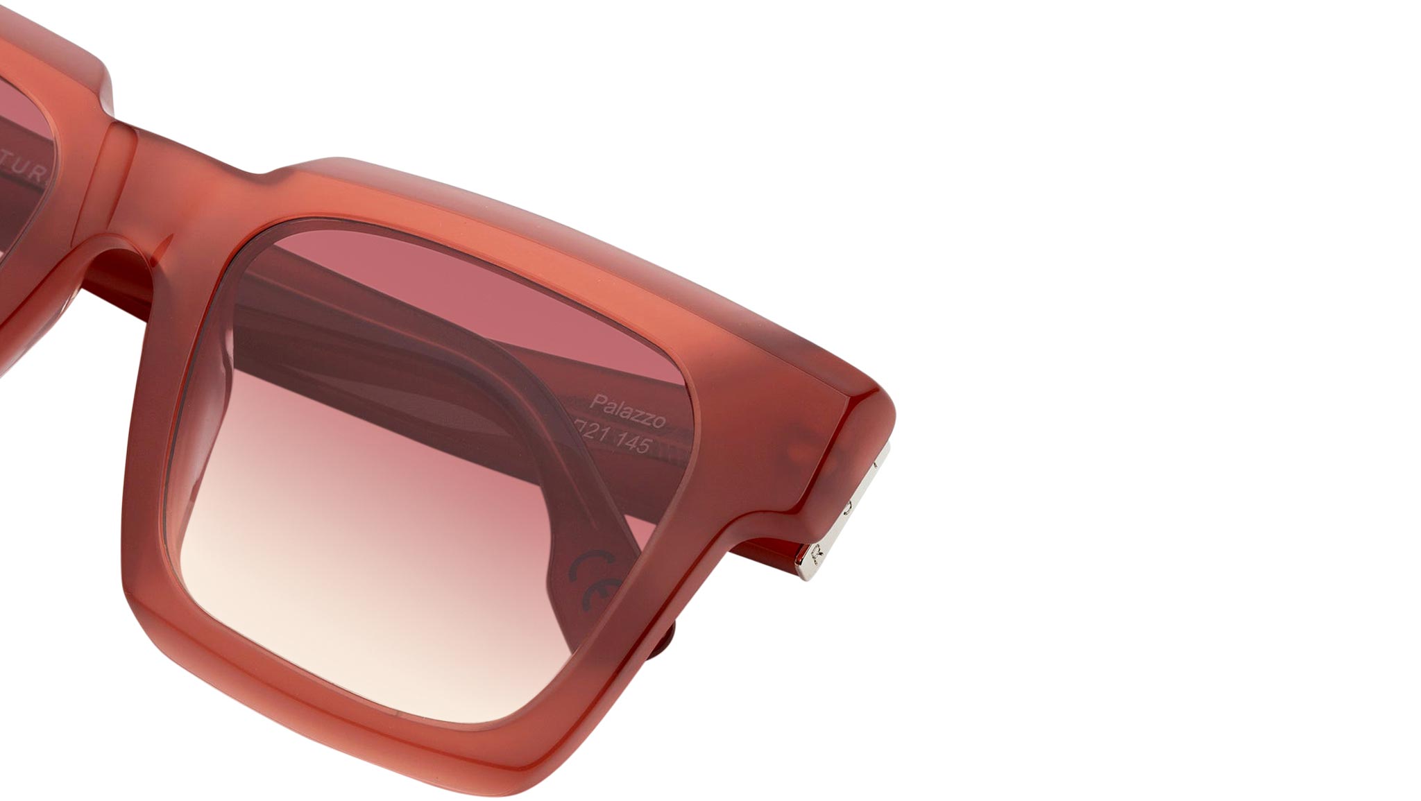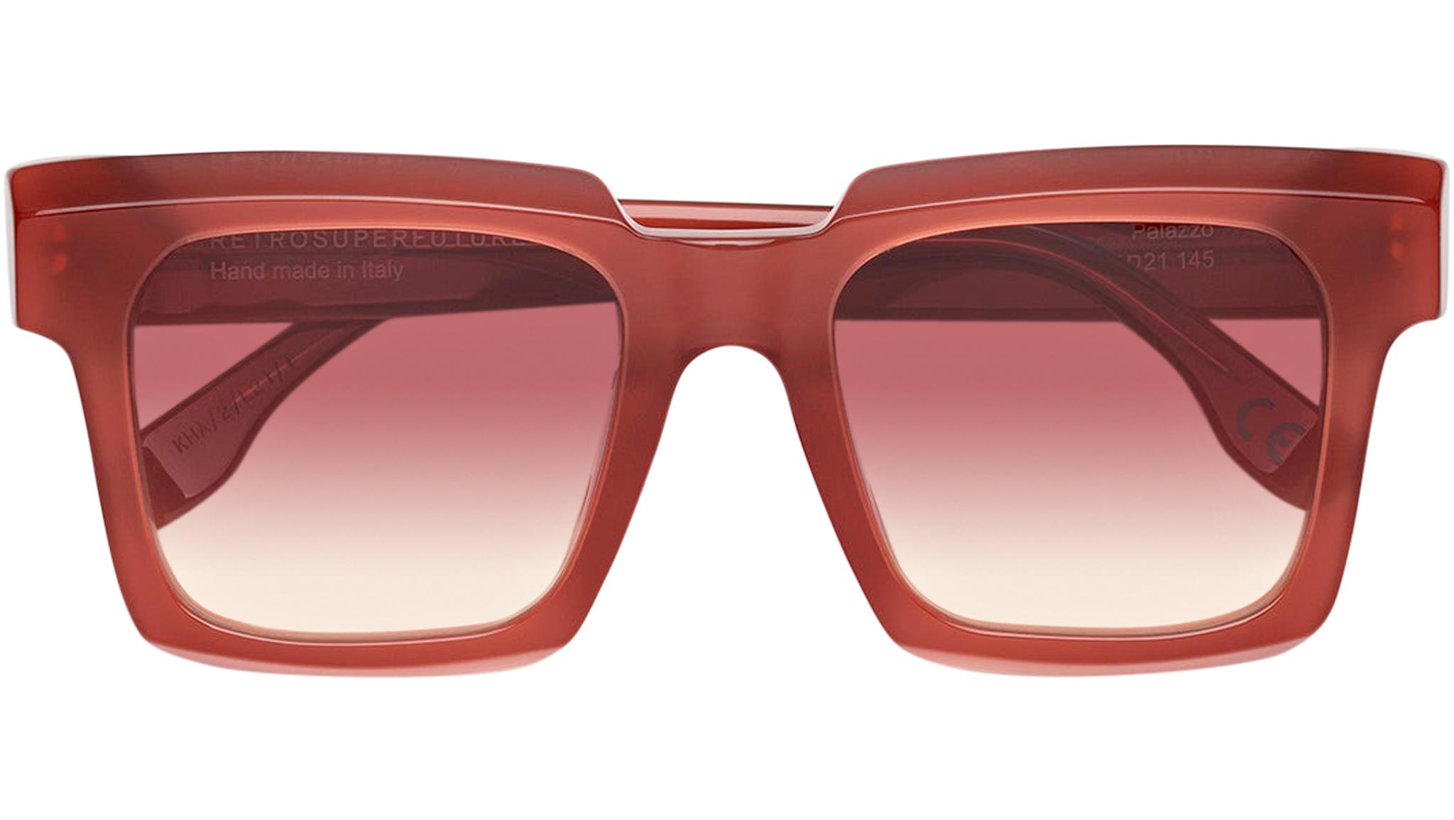 A piece of eyewear that is much more than just a pair of sunglasses: a sculptural object with geometric, architectural form designed to elevate Italian craftsmanship. Palazzo is an oversized and thick acetate frame, featuring angular temples and a low nose-bridge, with squared, vertical lenses encased within slanted and carved acetate rims. This version features a warm red tinted acetate and matching faded lenses. Sizes: R Lens Width: 52 mm. Frame Front: Frame Side: 145 mm. Product Code Size R: KHA