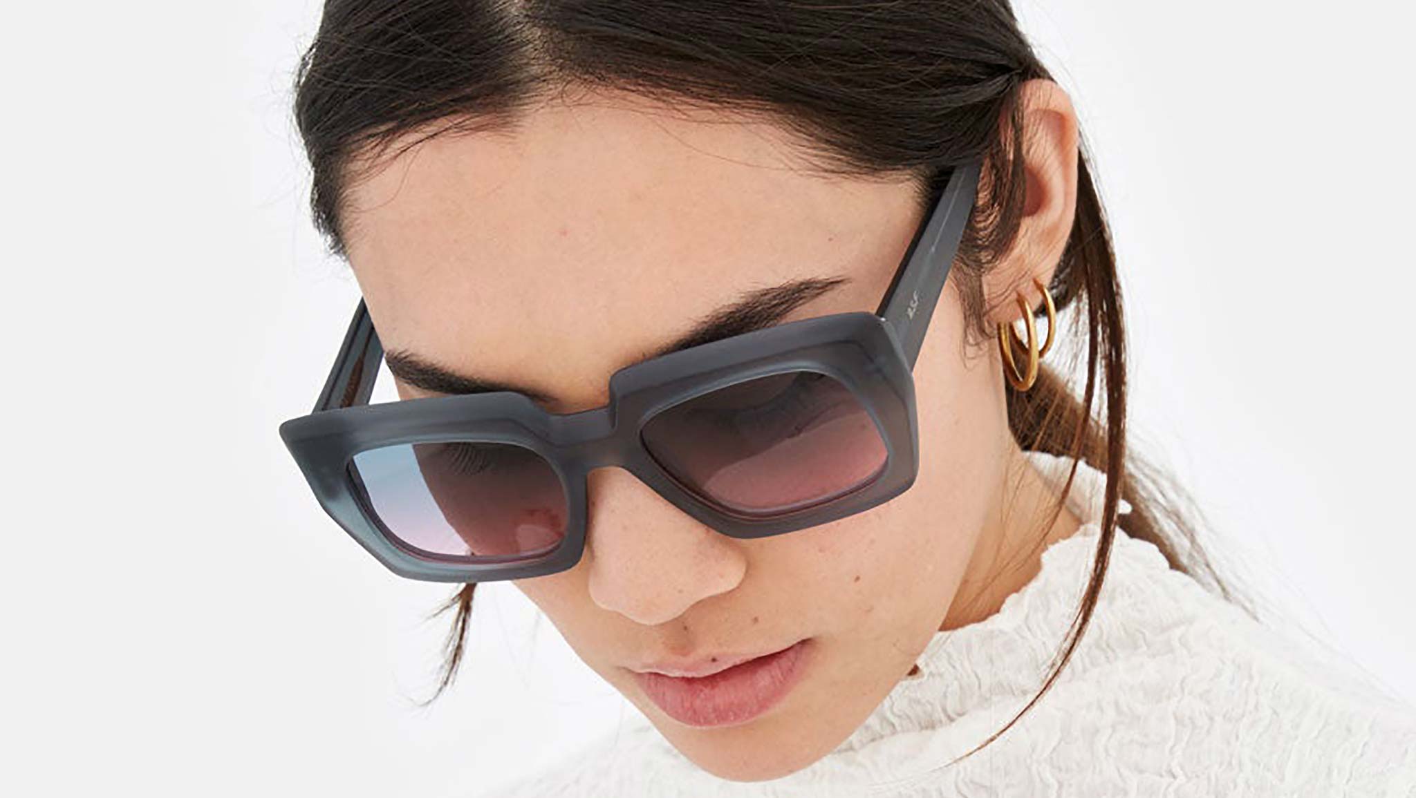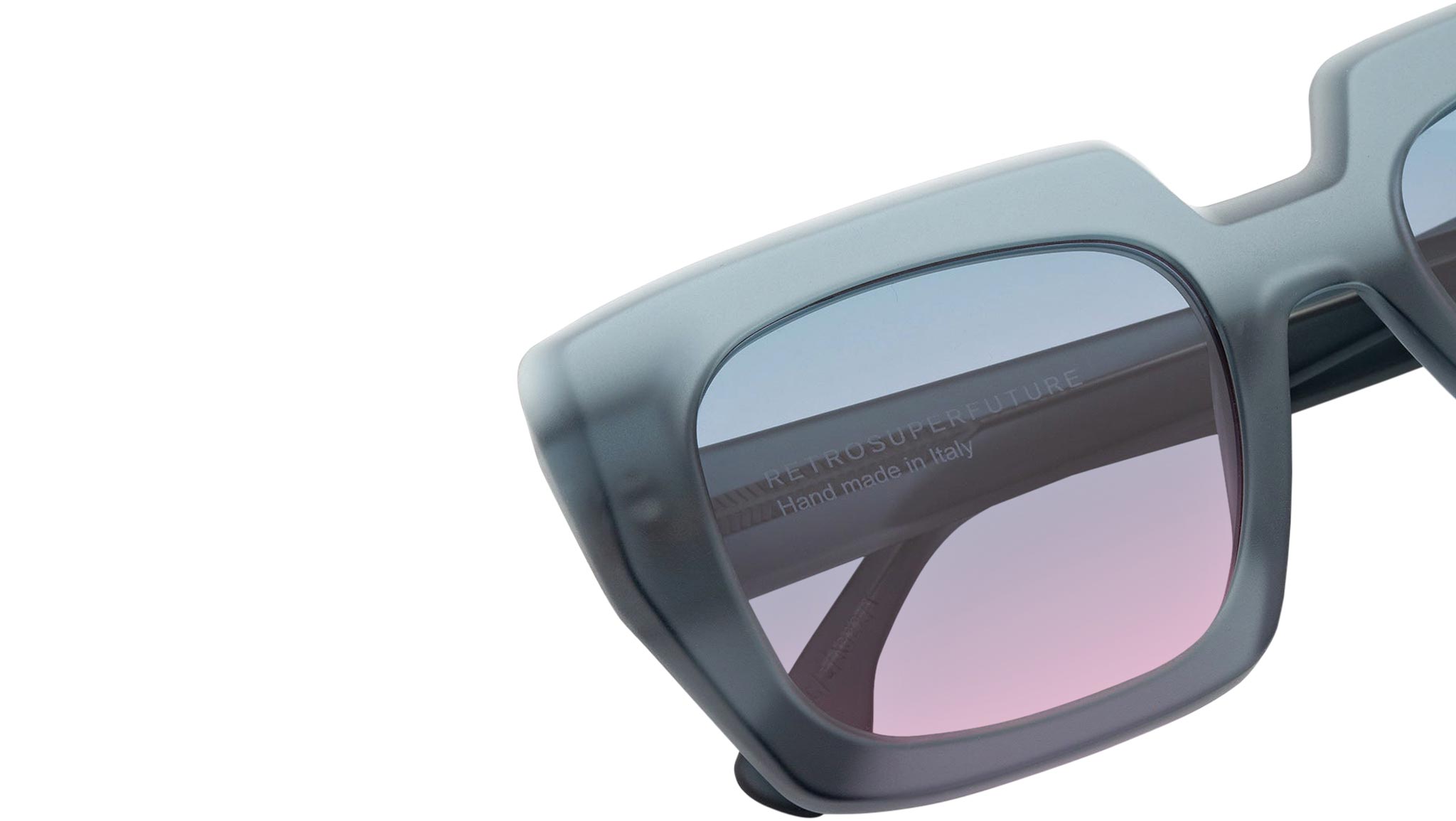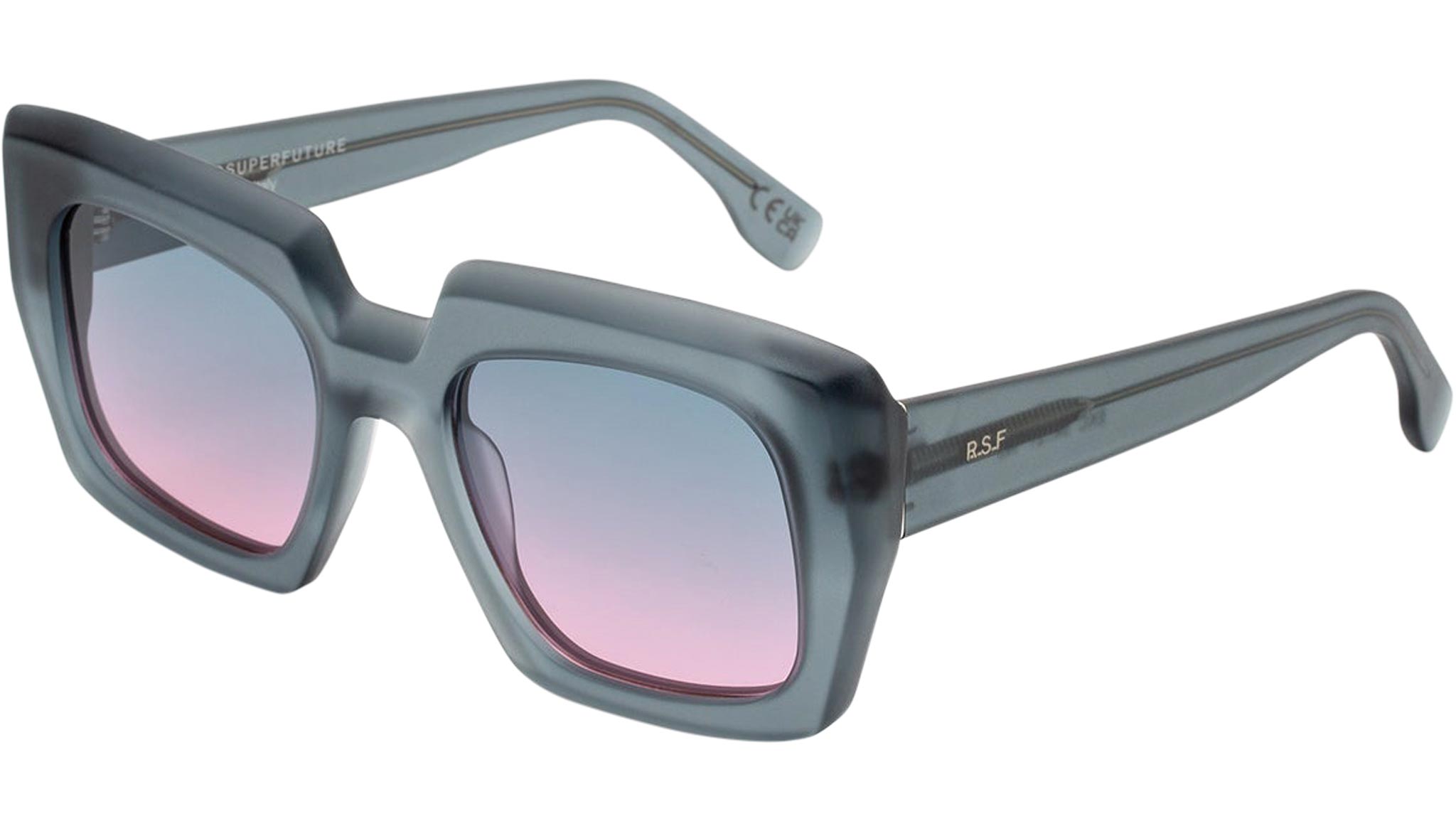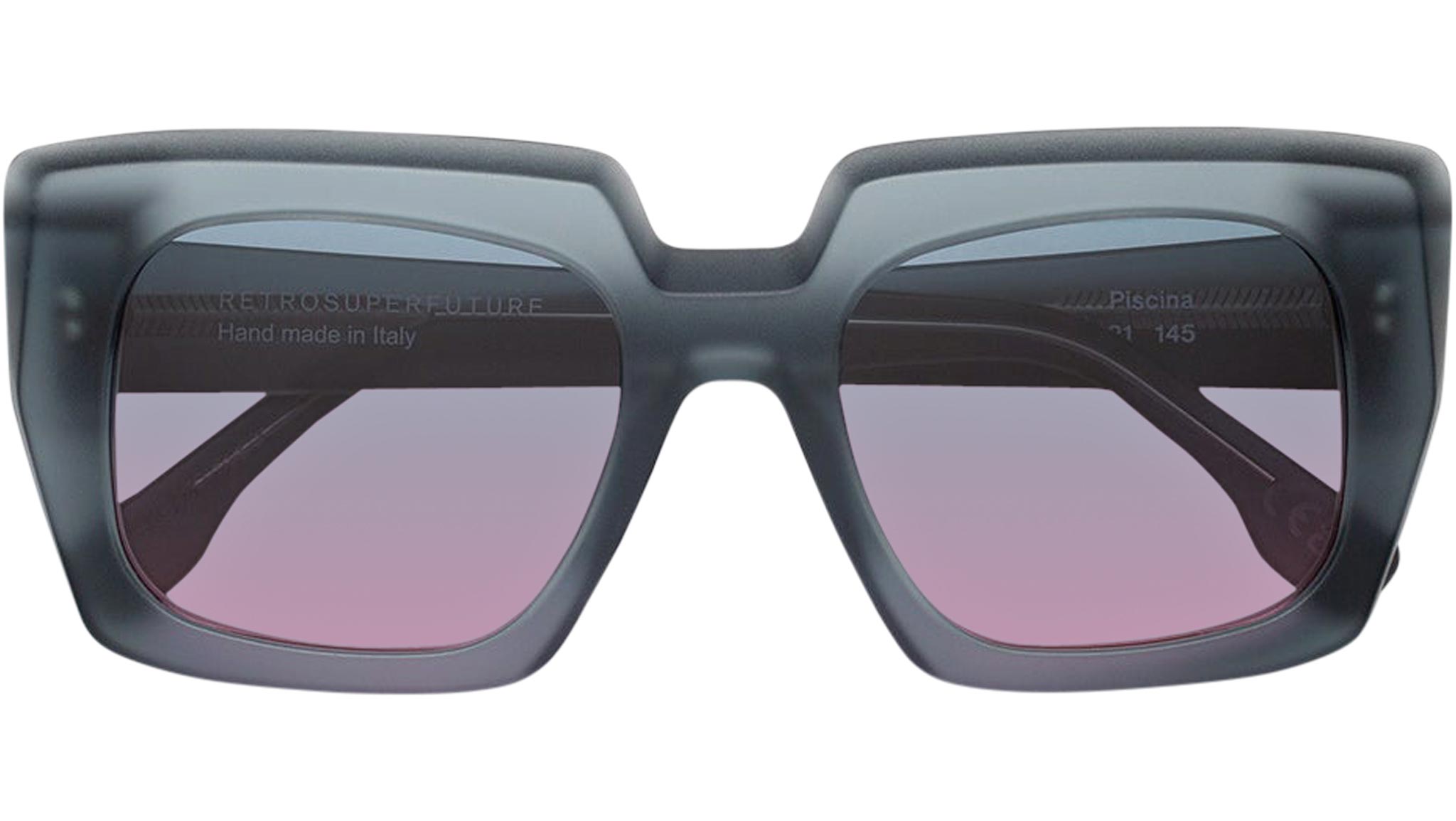 Piscina is a statement piece of eyewear characterized by its unique geometric design, stand-out oversized lenses and thick sculpted rims. The model is inspired by over-the-top late 70s aesthetics, reinterpreted for a more cutting-edge contemporary sensibility. A unisex design, Piscina features thick rims on the upper line, chiselled to form a slanted, elegant profile. Bold temples and a thick nose-bridge complete this model that is brimming with character. This version features a grey-blue tinted matte acetate with fading purple lenses. Sizes: R Lens Width: 54 mm Frame Front: Frame Side: 145 mm Product Code Size R: EKC