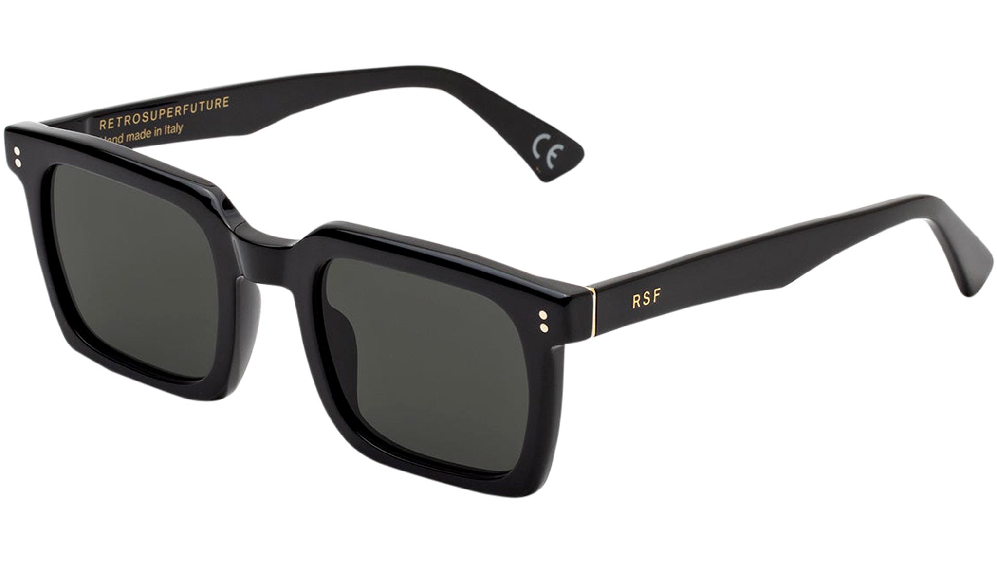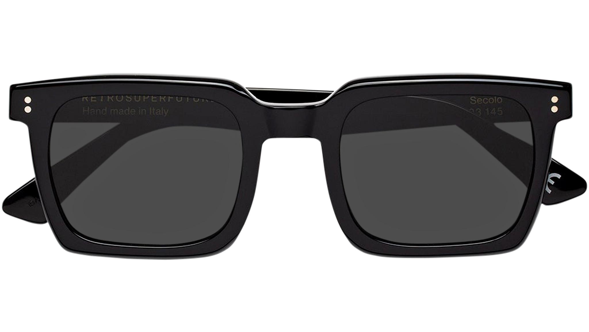 Secolo is an essential geometric silhouette with a distinctive architectural quality, where precise angles of the frame are balanced with its rounded lenses. This is an uncompromising, yet fitting shape for those looking for elegant, squared sunglasses with a unique modernist character. Its apparent simplicity and aesthetic purity conceal carefully crafted details, such as its pointed temple tips and sharp angular detailing on the temples. Secolo comes in a shiny black acetate with matching lenses. Sizes: Lens Width: 50 mm. Frame Front: Frame Side: 145 mm.