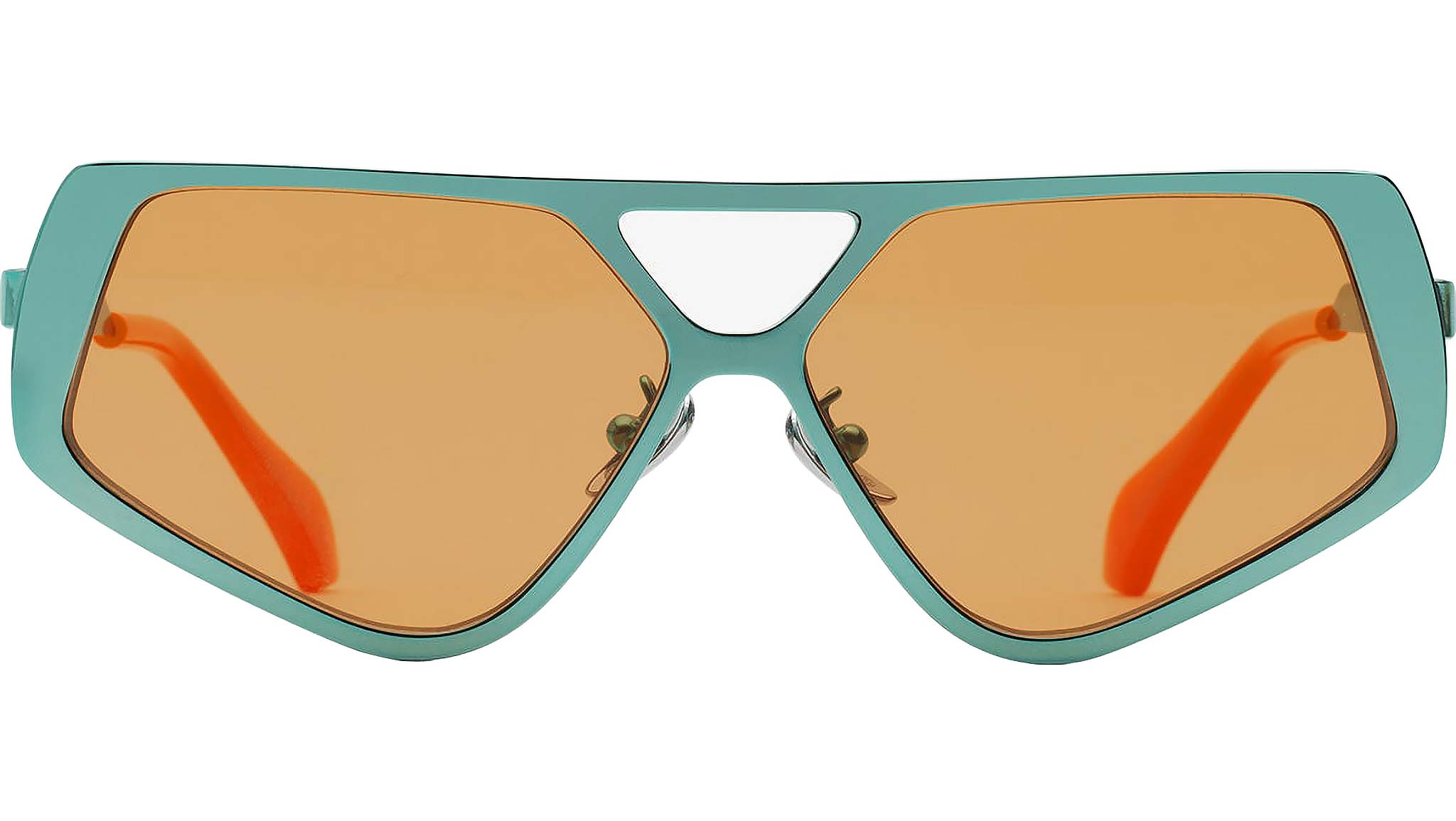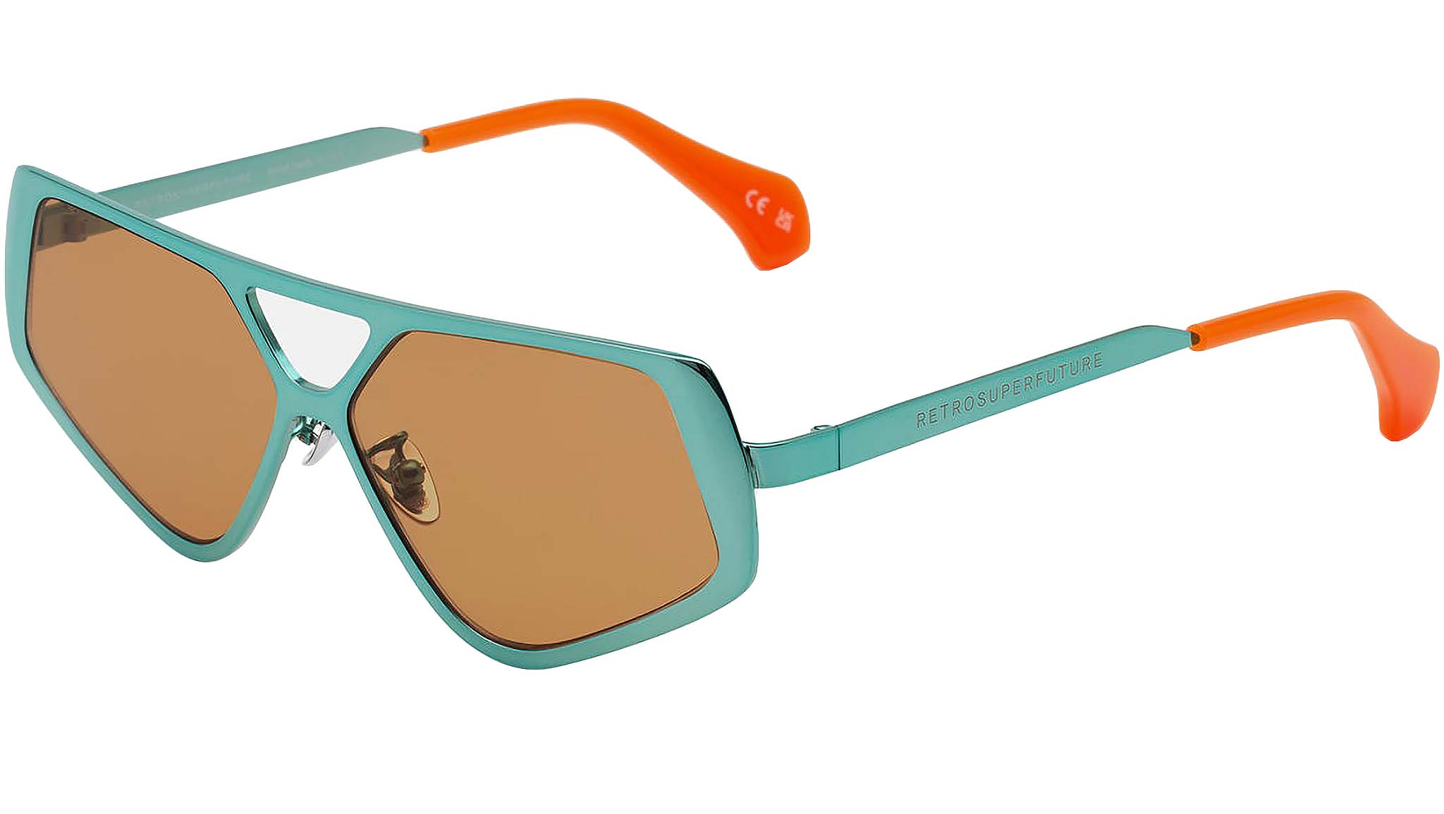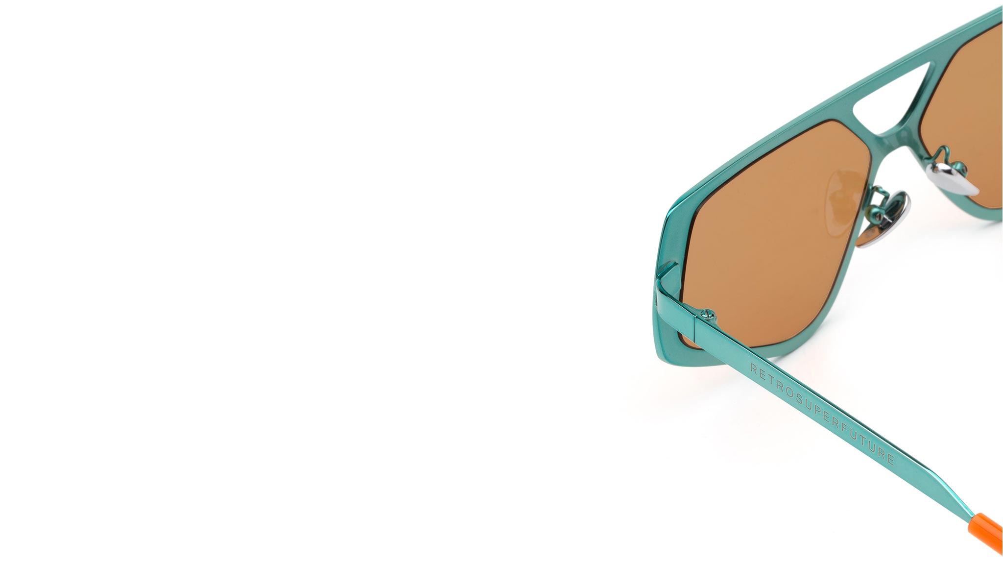 Spazio is a forward-looking shape whose retrosuperfuturistic design offers a fresh interpretation of metal eyewear construction. Its thick rims have been cast in a pentagonal shape with a double nose-bridge for a study and innovative silhouette. This is an uncompromising piece that elevates classic metal aviator shapes to new aesthetic levels. This version comes in a bright turquoise chromed finish with light brown tinted lenses. The box contains a semi-hard case and a cleaning cloth. Sizes: R Lens Width: 58 mm. Frame Front: Frame Side: 140 mm. Product Code Size R: 1QM