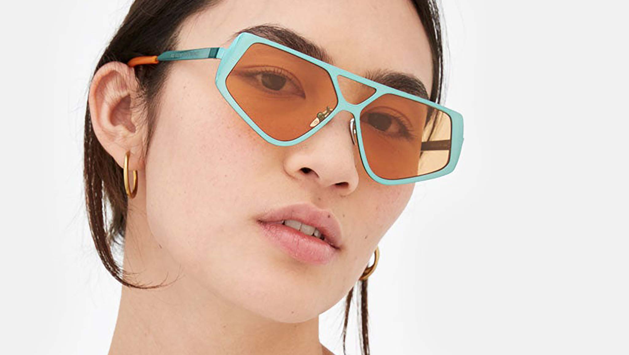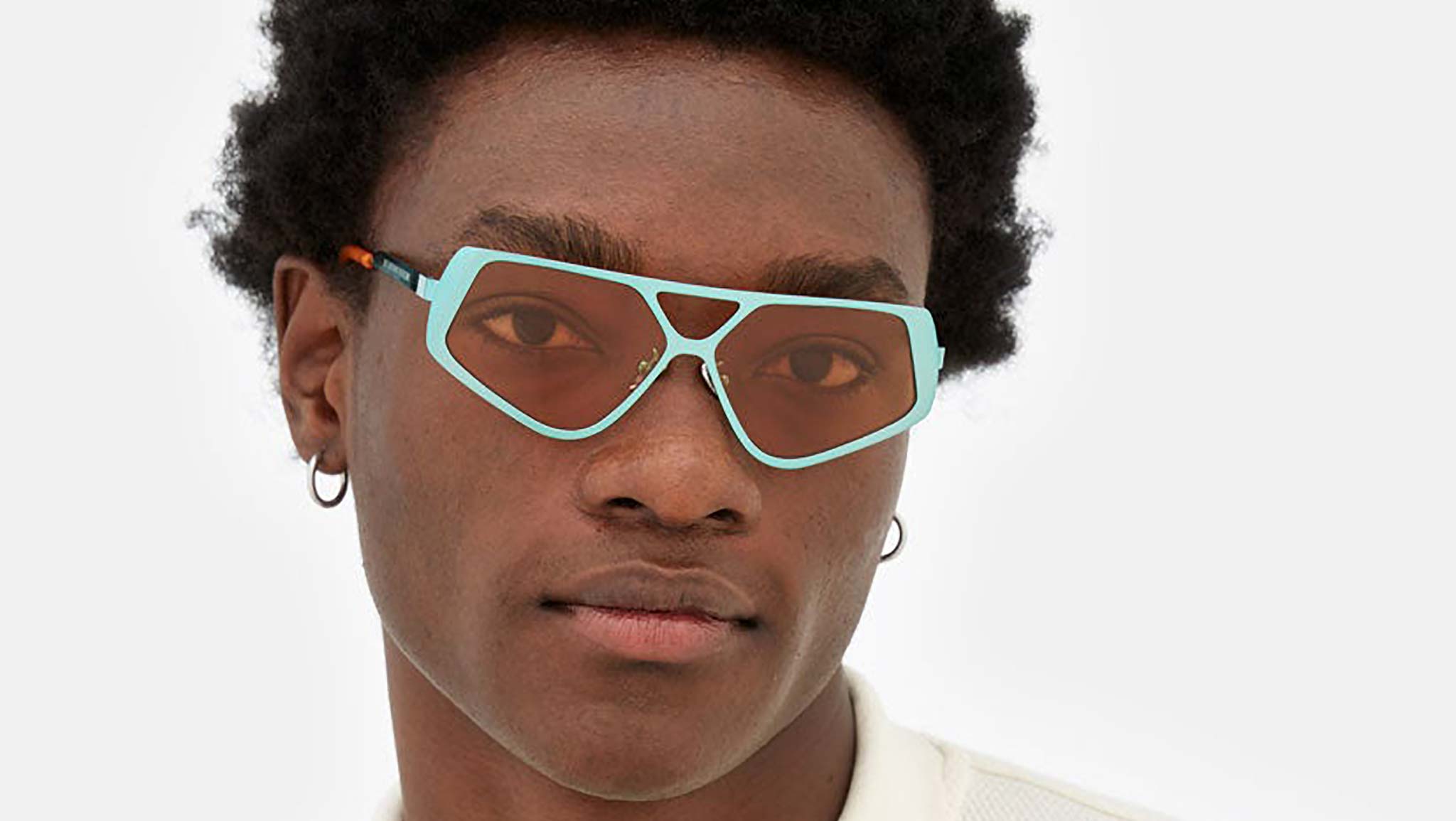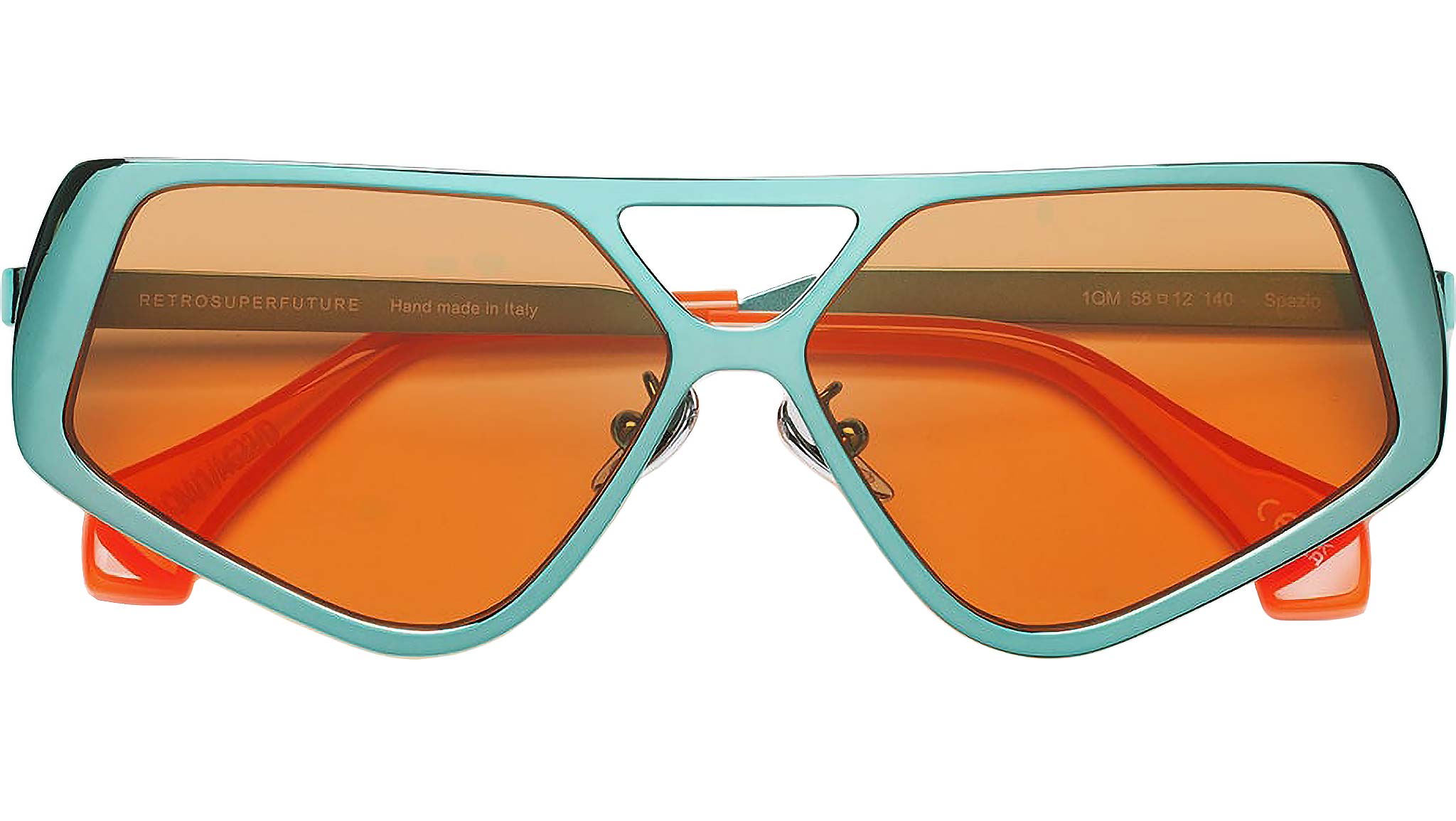 Spazio is a forward-looking shape whose retrosuperfuturistic design offers a fresh interpretation of metal eyewear construction. Its thick rims have been cast in a pentagonal shape with a double nose-bridge for a study and innovative silhouette. This is an uncompromising piece that elevates classic metal aviator shapes to new aesthetic levels. This version comes in a bright turquoise chromed finish with light brown tinted lenses. The box contains a semi-hard case and a cleaning cloth. Sizes: R Lens Width: 58 mm. Frame Front: Frame Side: 140 mm. Product Code Size R: 1QM