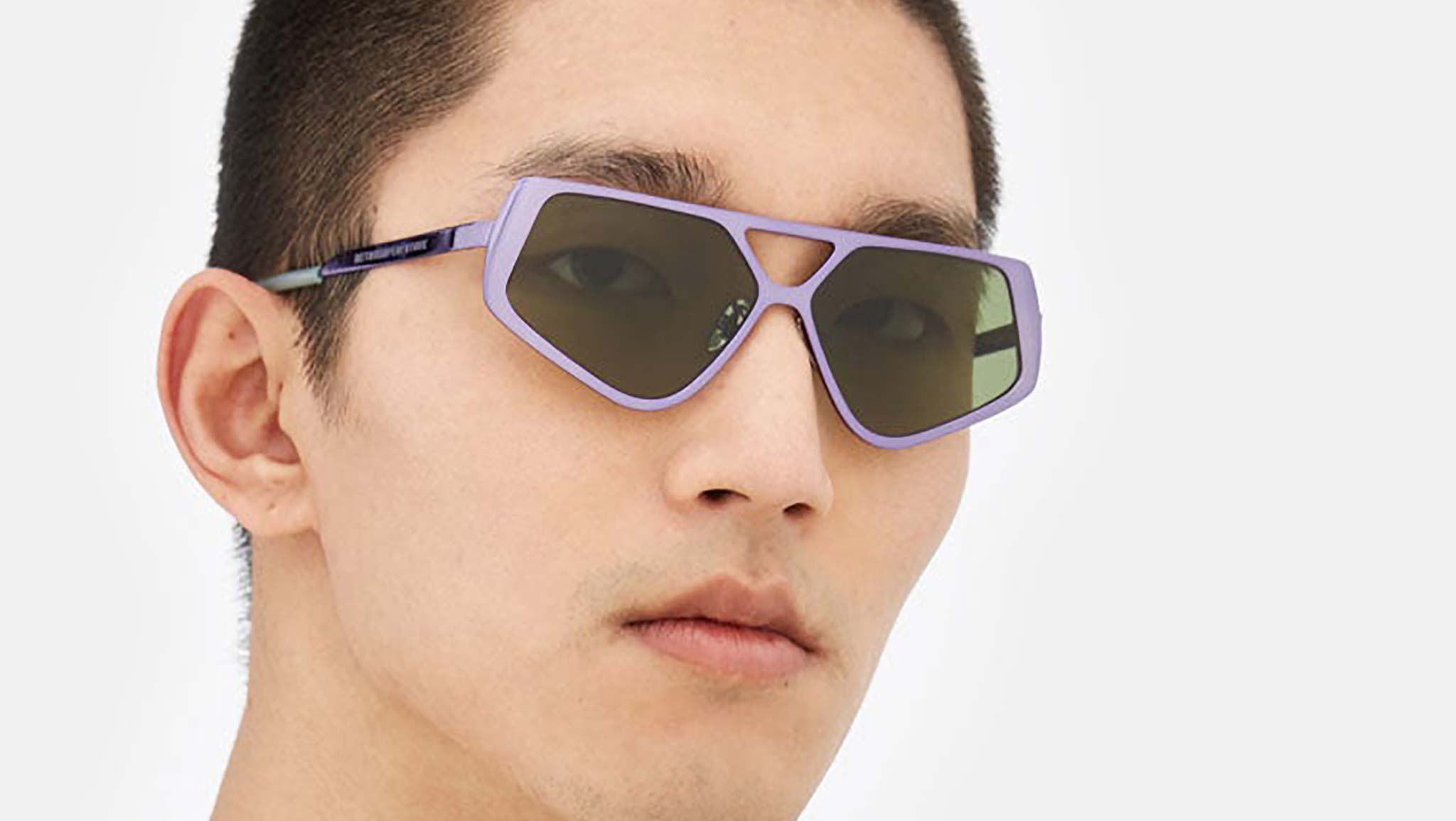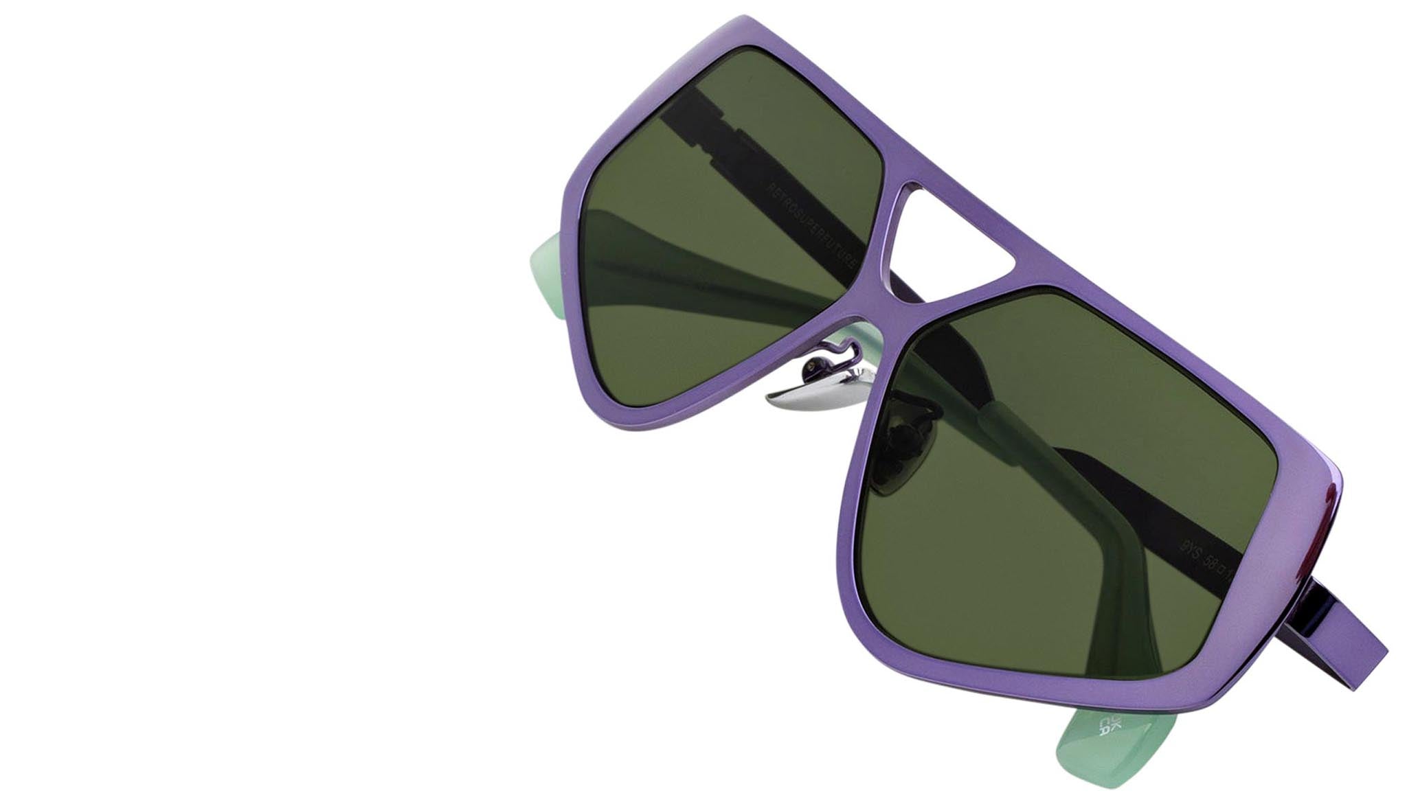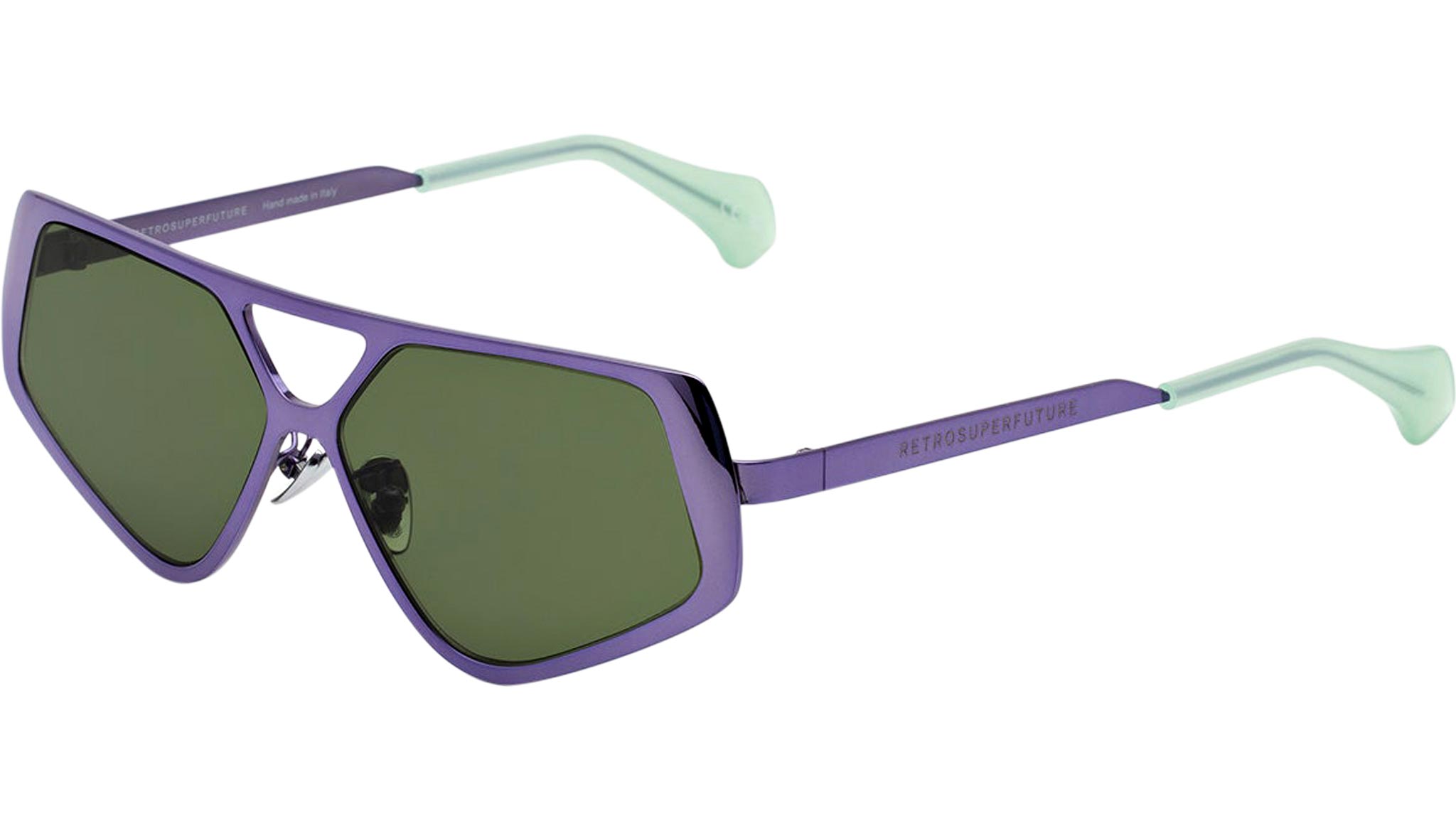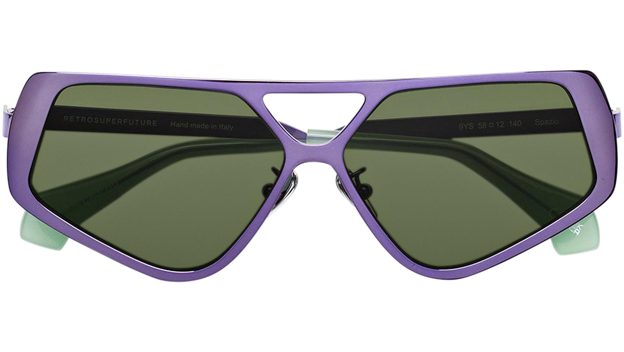 Spazio is a forward-looking shape whose retrosuperfuturistic design offers a fresh interpretation of metal eyewear construction. Its thick rims have been cast in a pentagonal shape with a double nose-bridge for a study and innovative silhouette. This is an uncompromising piece that elevates classic metal aviator shapes to new aesthetic levels. This version comes in a sleek violet chromed finish with light tinted lenses. The box contains a semi-hard case and a cleaning cloth. Sizes: R Lens Width: 58 mm. Frame Front: Frame Side: 140 mm. Product Code Size R: 9YS