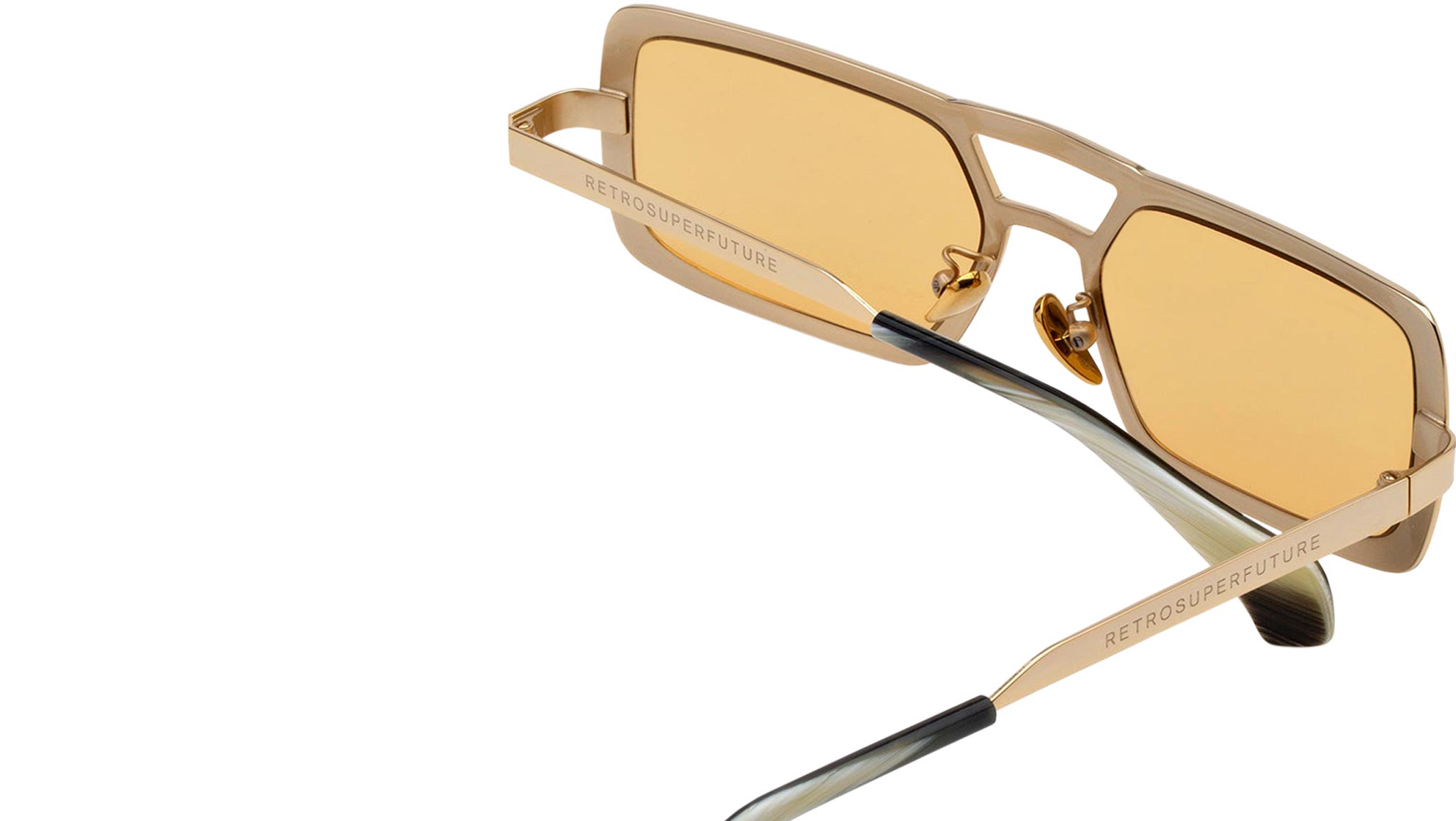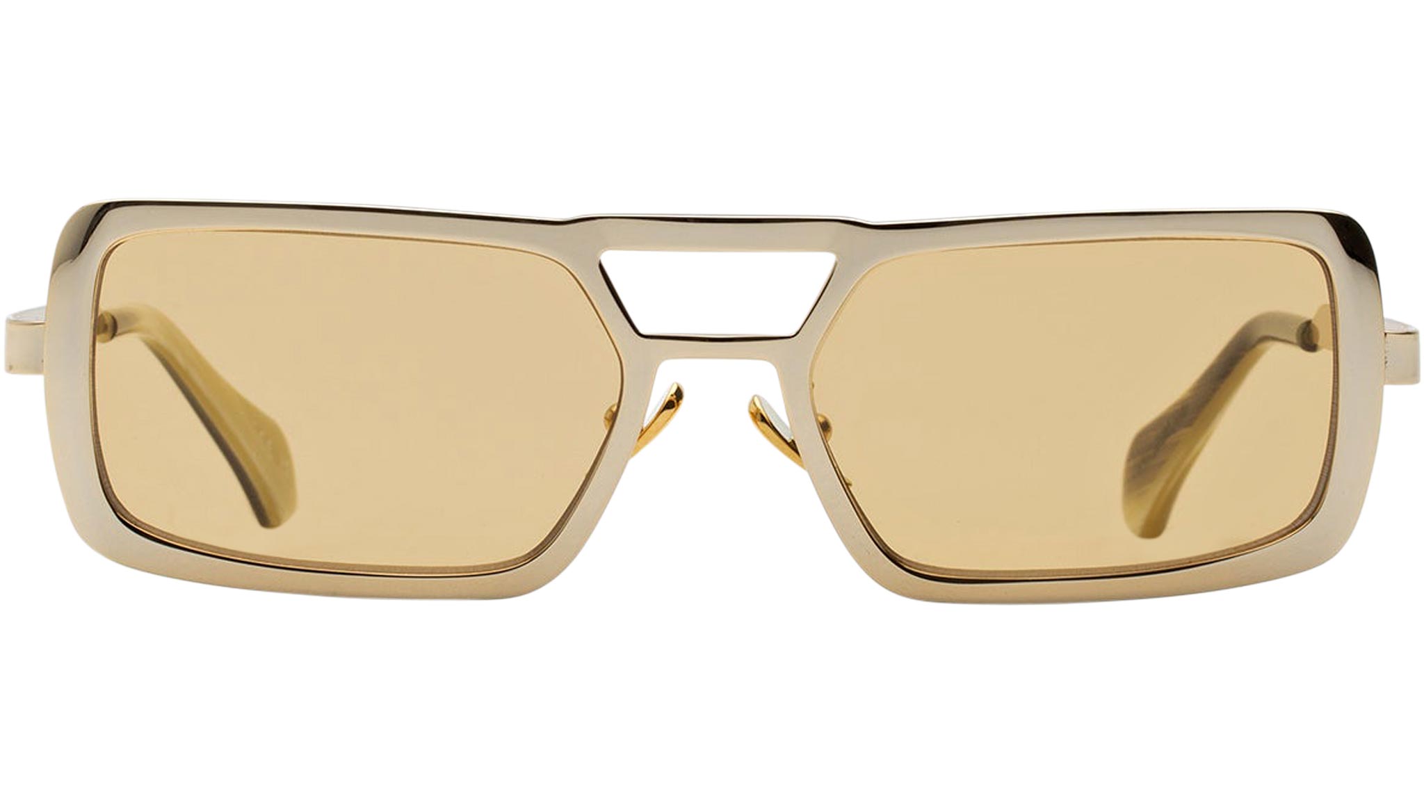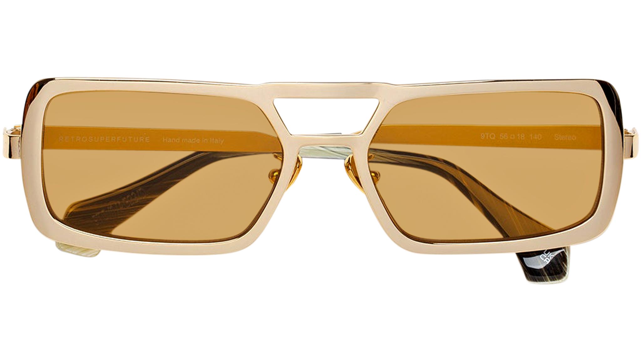 Stereo works on elevating the concept of metal designs with its unique design, structure and sophisticated finishes. The model is conceived as a retrosuperfuturistic interpretation of timeless metal sunglasses, with its prominent double nose-bridge and thick rims. Its wide, oversized geometries are highlighted by fresh and playful chromed finishes: a shiny gold polish paired with mustard yellow lenses for a tone-on-tone retro-haze statement. Sizes: R Lens Width: 56 mm Frame Front: Frame Side: 140 mm Product Code Size R: 9TQ