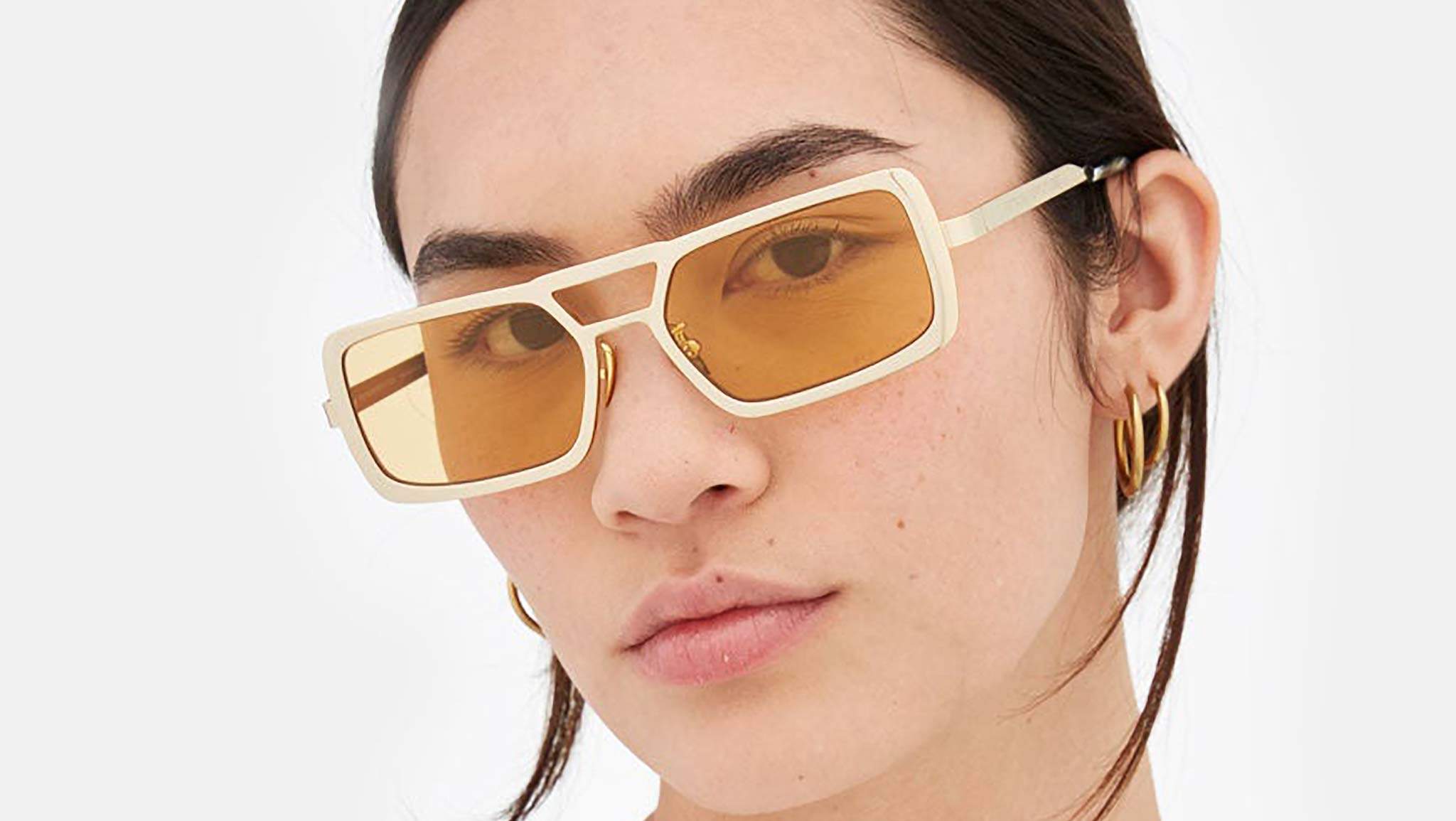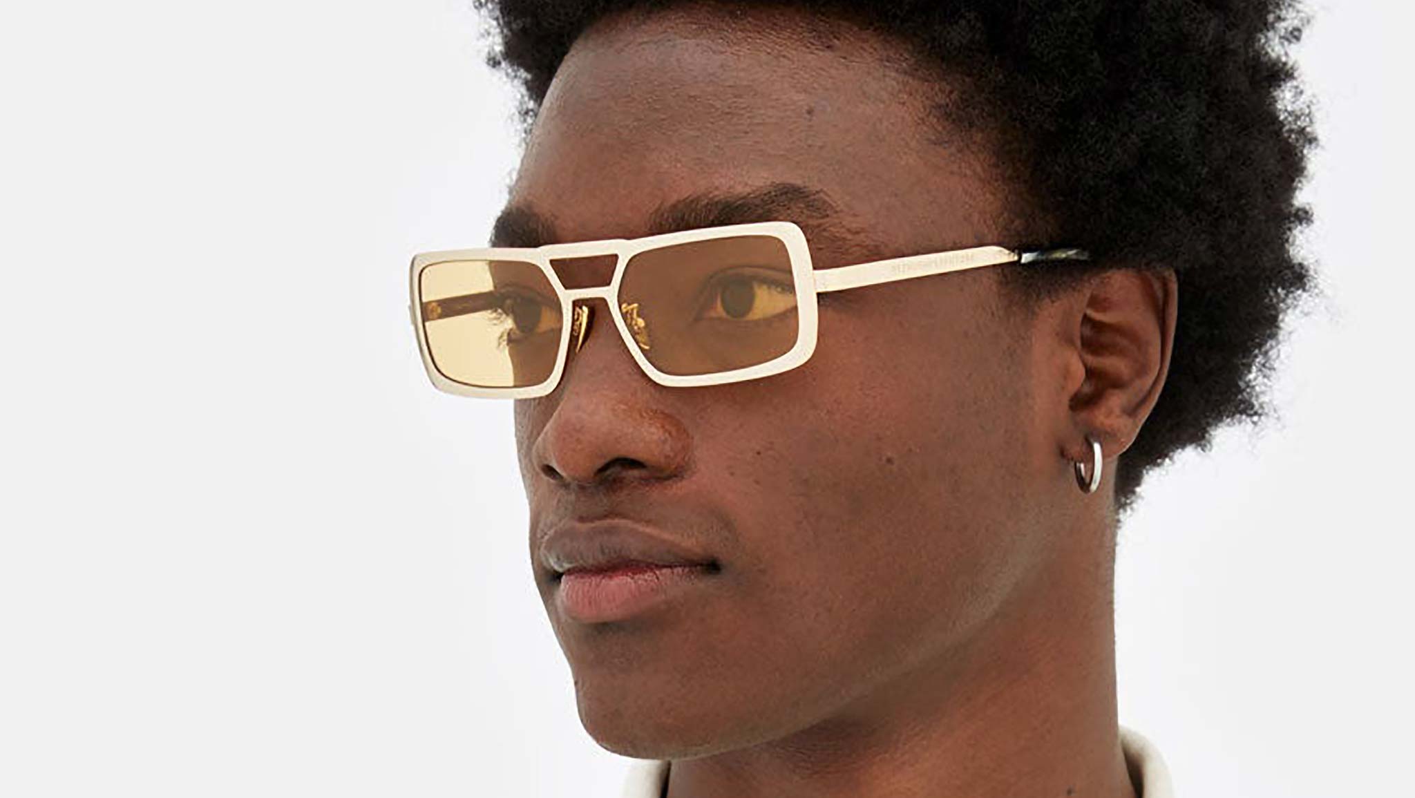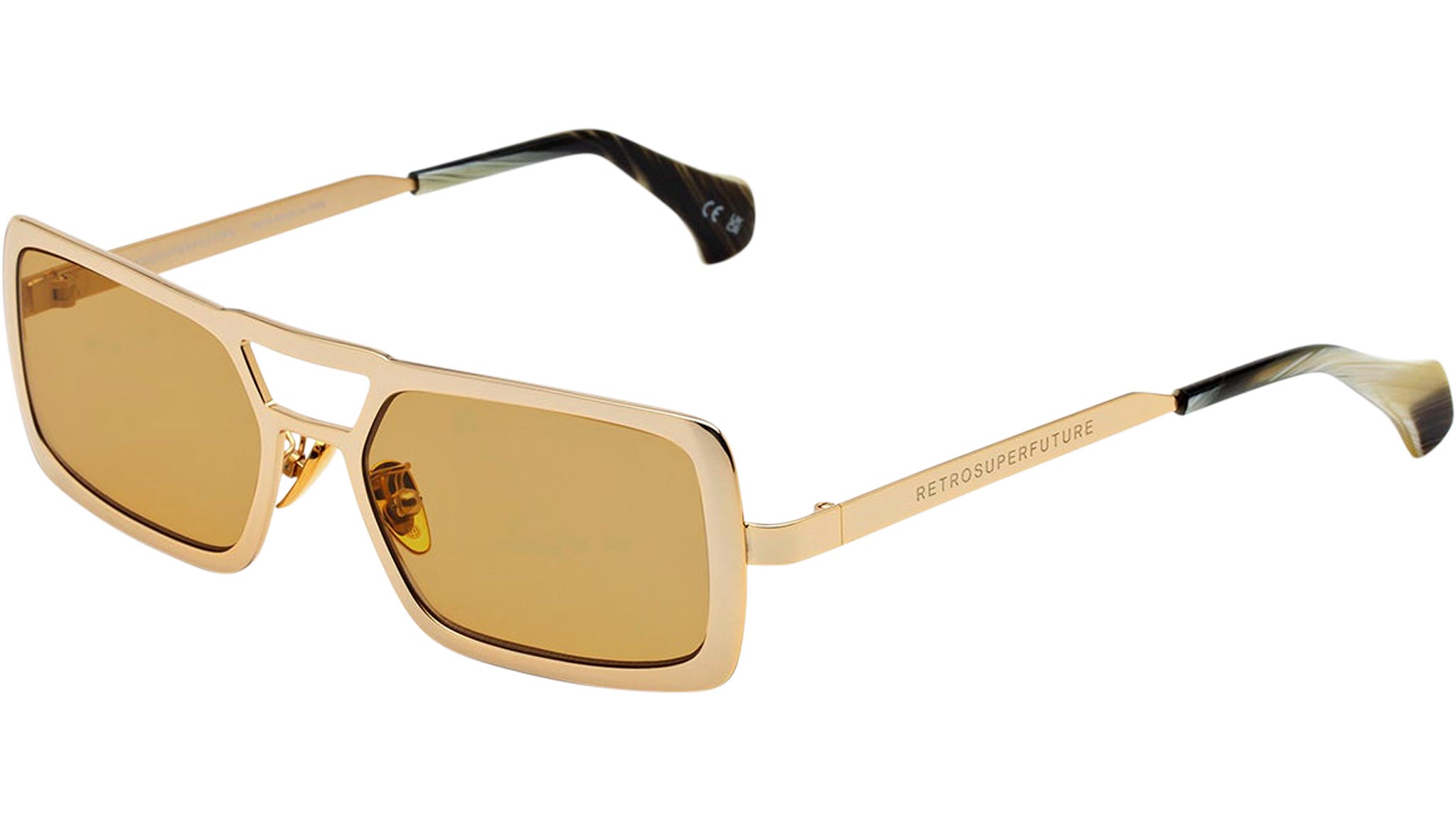 Stereo works on elevating the concept of metal designs with its unique design, structure and sophisticated finishes. The model is conceived as a retrosuperfuturistic interpretation of timeless metal sunglasses, with its prominent double nose-bridge and thick rims. Its wide, oversized geometries are highlighted by fresh and playful chromed finishes: a shiny gold polish paired with mustard yellow lenses for a tone-on-tone retro-haze statement. Sizes: R Lens Width: 56 mm Frame Front: Frame Side: 140 mm Product Code Size R: 9TQ
