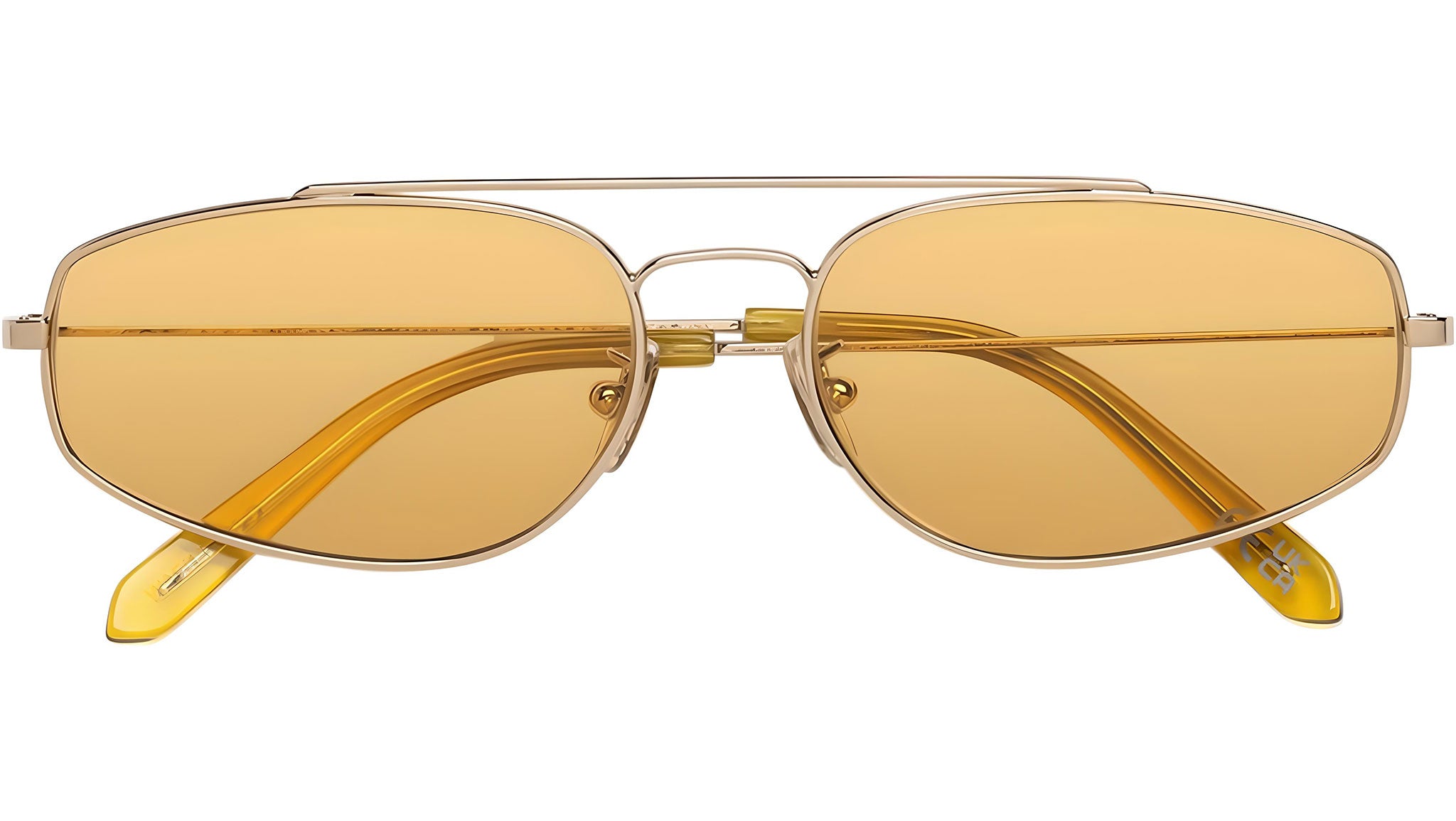 Tema is a determined, sharp and innovative silhouette that pushes the aesthetics of early-2000s minimalism. Characterized by a light yet sturdy metal structure, long double bridge and low-riding wide lenses, this is a cutting-edge piece of eyewear. This version of the Tema features elegant and classic finish with gold metal galvanic and tone-on-tone mustard lenses and matching soft mustard acetate on the temple tips. Sizes: R. Lens Width: 59 mm. Frame Front: 0 mm. Frame Side: 140 mm. Product Code Size R: WAF.