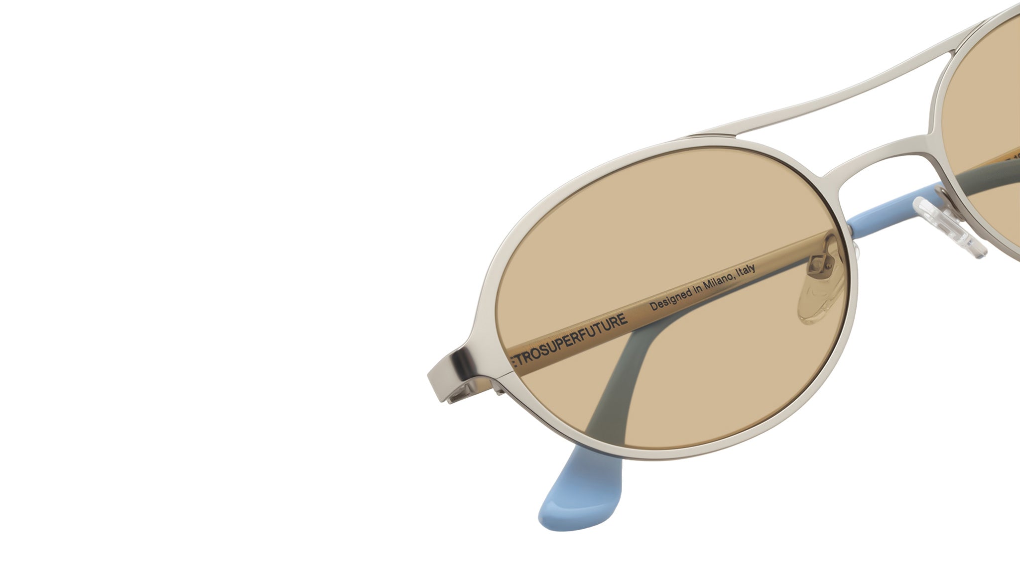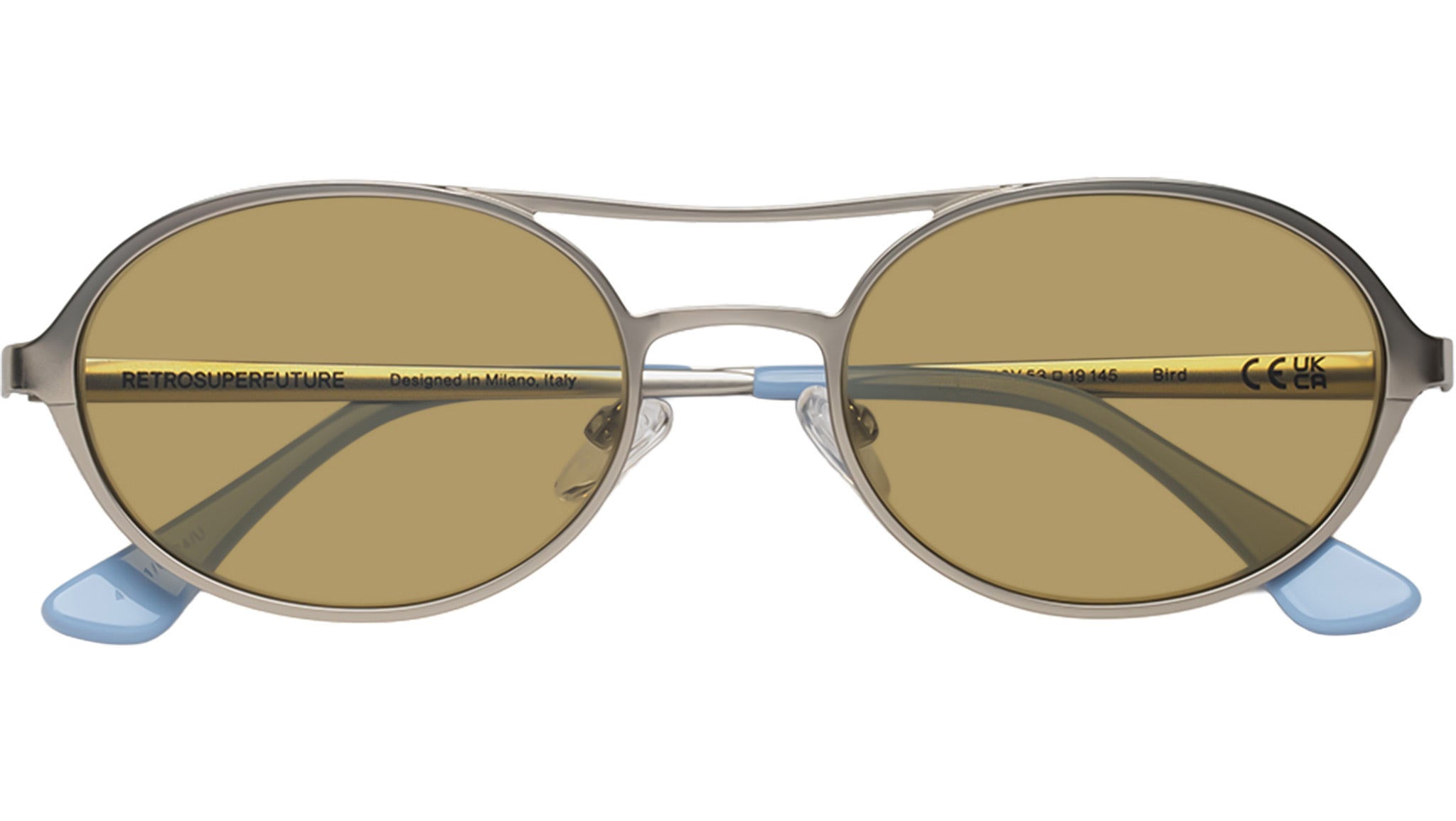 Occhiali da sole Retrosuperfuture Bird Coolcat con montatura in acetato argento e lenti color marrone. Codice modello: 43V. Made in Italy. Rivenditore autorizzato RSF online. Gli occhiali vengono consegnati con custodia e accessori originali e sono coperti dalla garanzia ufficiale di 12 mesi del produttore.
