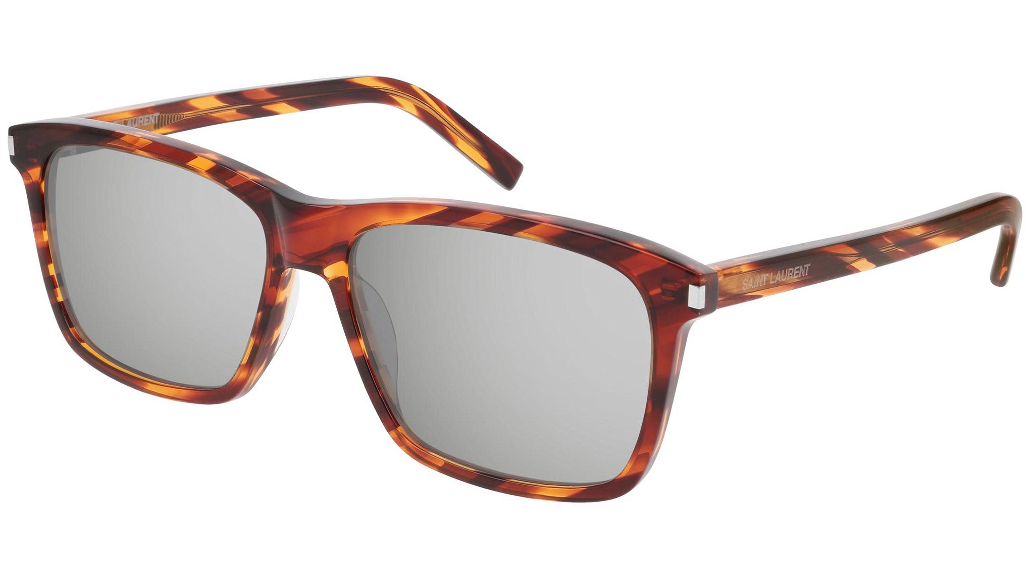Il modello da sole SL 339 004 della maison Yves Saint Laurent, con montatura avana rosso striato argento e lenti color grigio argento specchiate. Saint Laurent Eyewear rappresenta in pieno le attitudini uniche del brand: stile senza tempo coniugato a un moderno concetto di lusso. La collezione sole offre una raffinata selezione di prodotti unici, contraddistinti da una qualità inarrivabile.