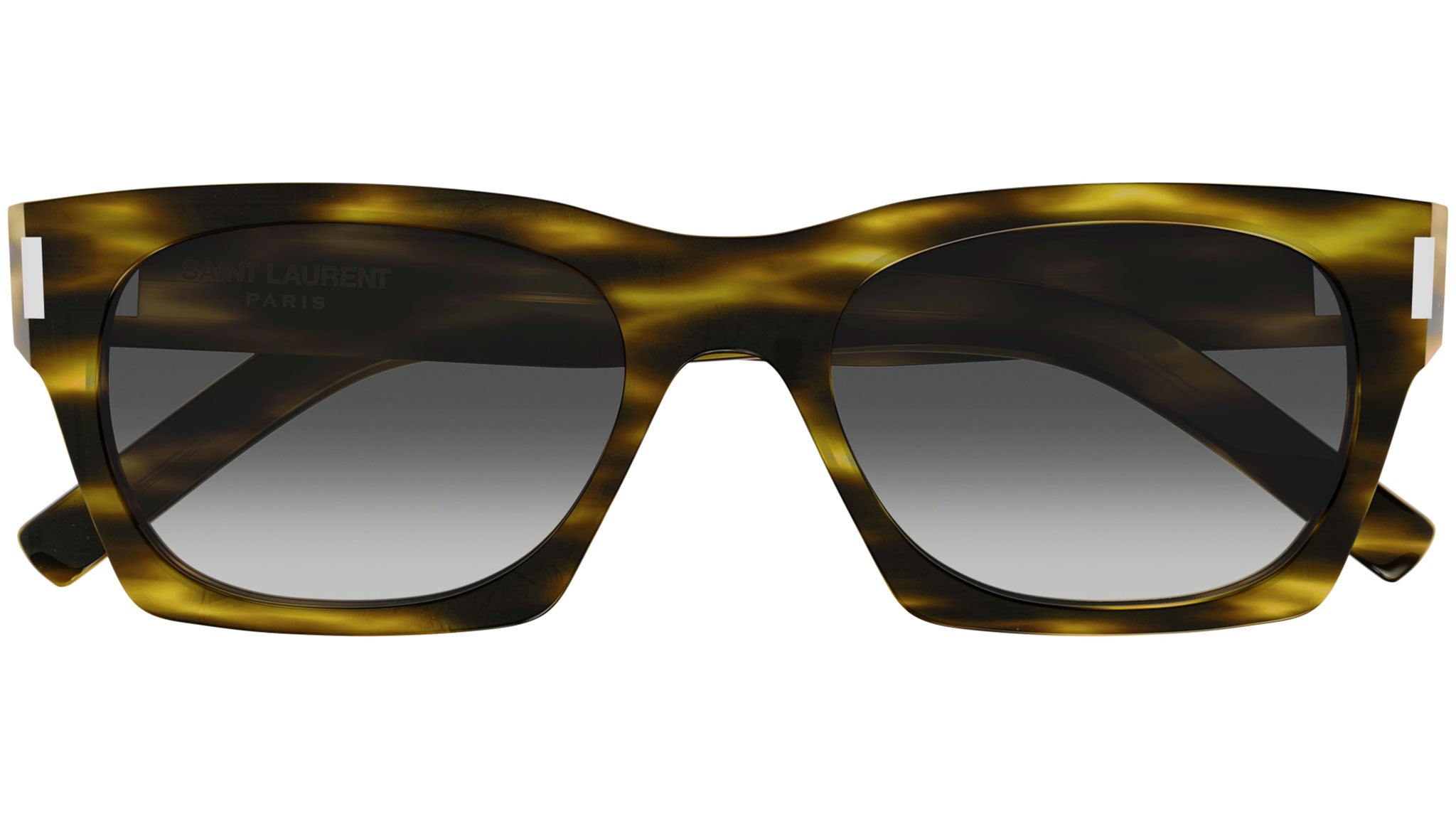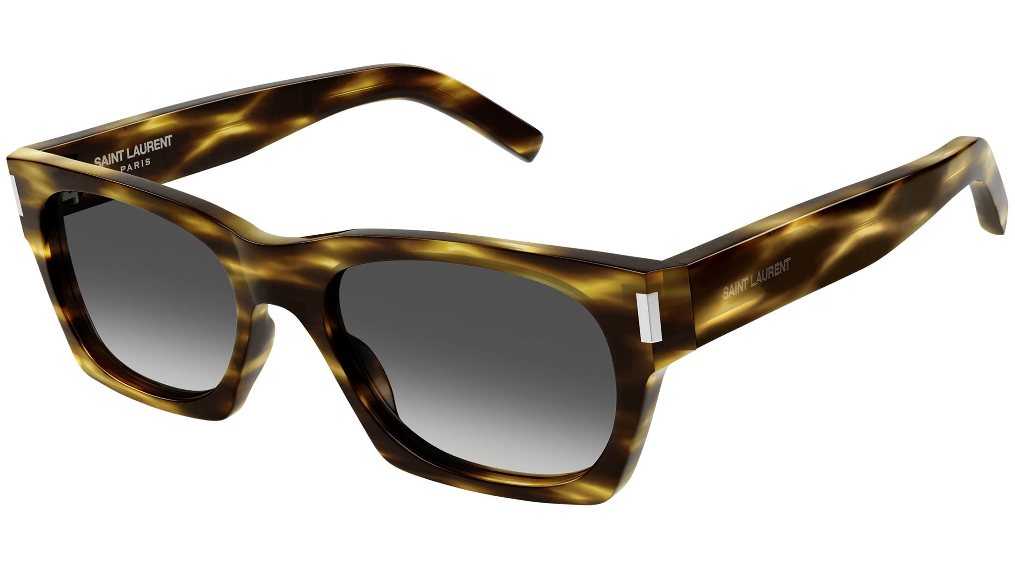 Occhiali da sole Saint Laurent modello SL 402 linea New Wave codice colore 016 avana fiammato lucido in acetato forma rectangle con lenti color grigio sfumato.