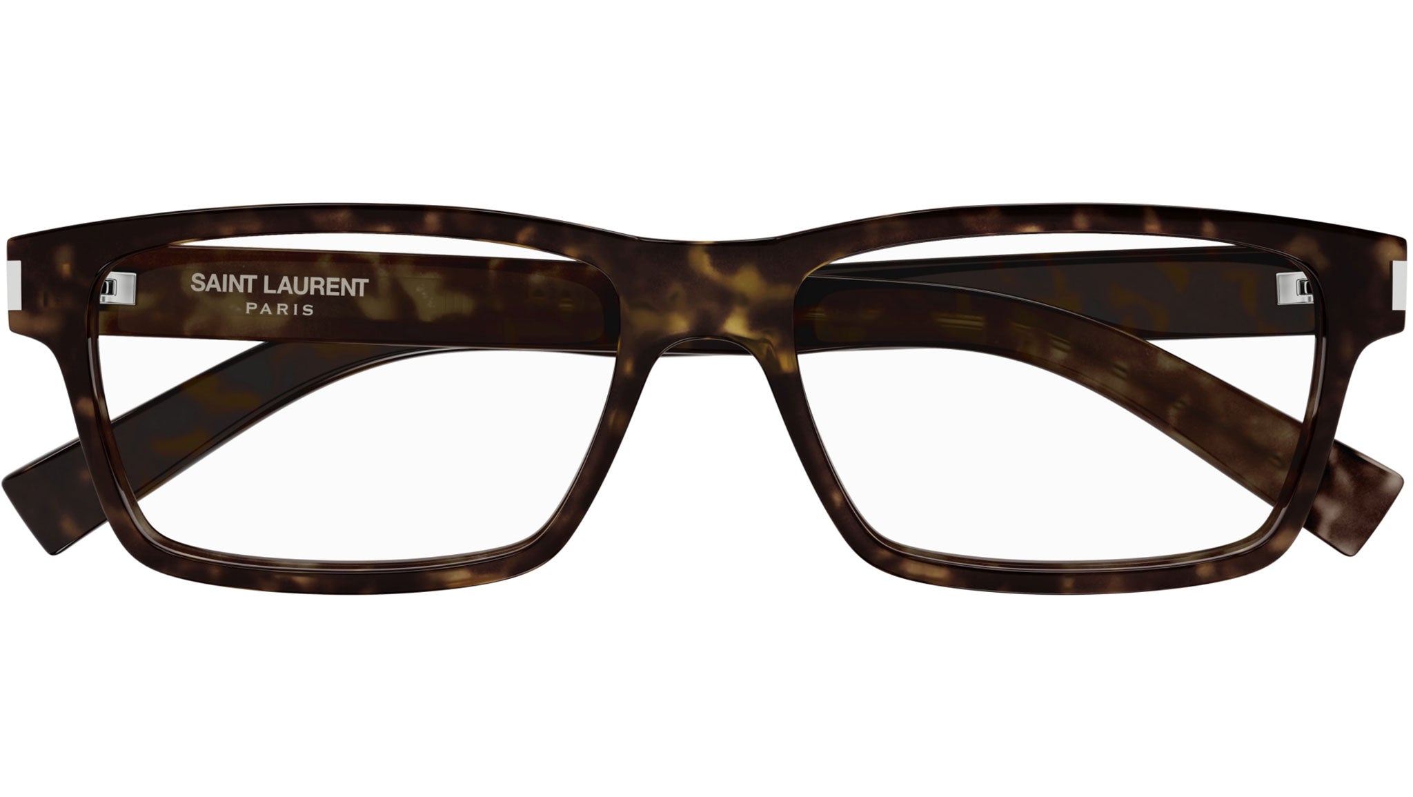 Occhiali da vista Saint Laurent modello SL 622 linea Classic codice colore 002 tartaruga scuro lucido in acetato riciclato forma rectangle con aste color cristallo trasparente.