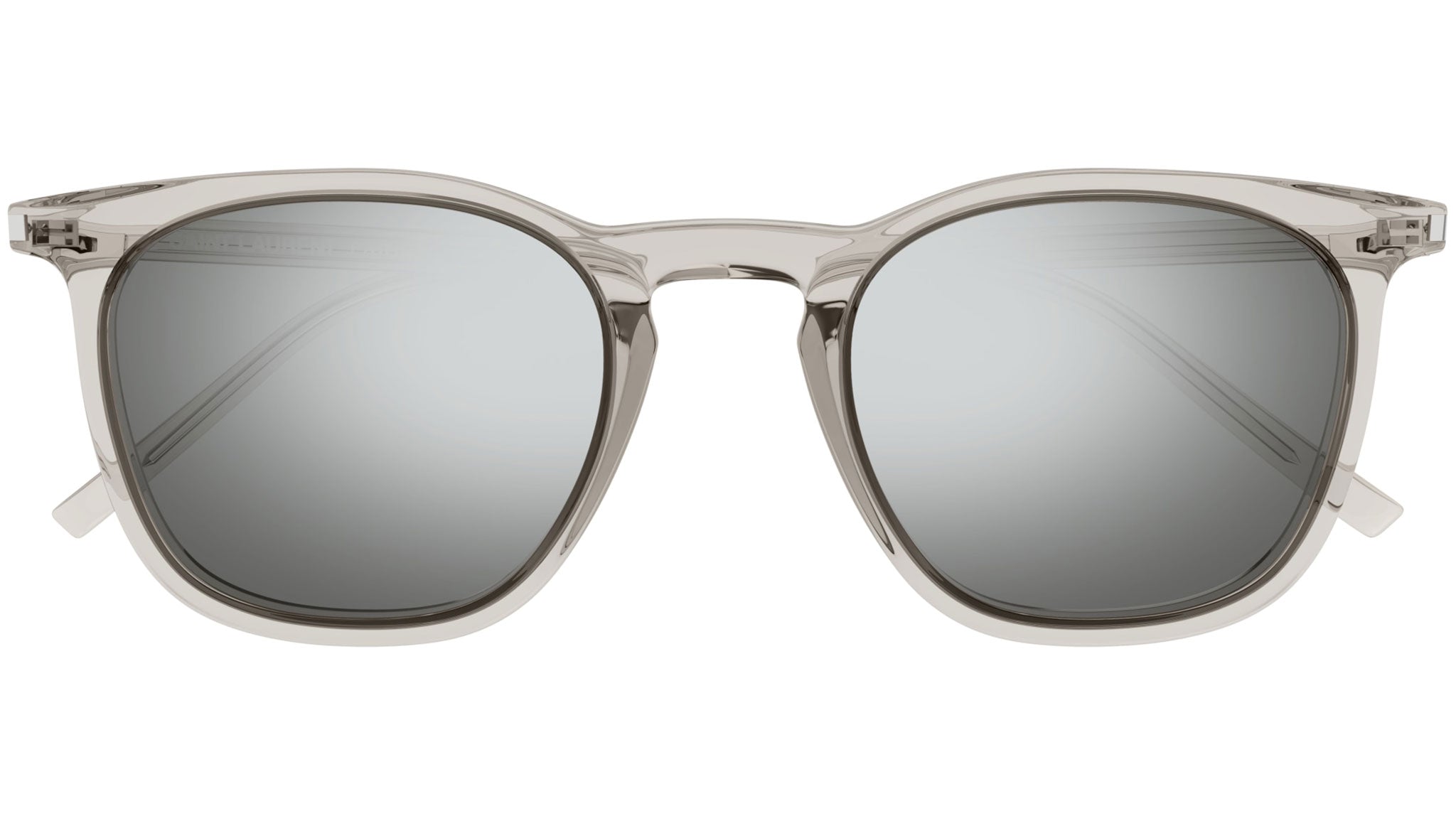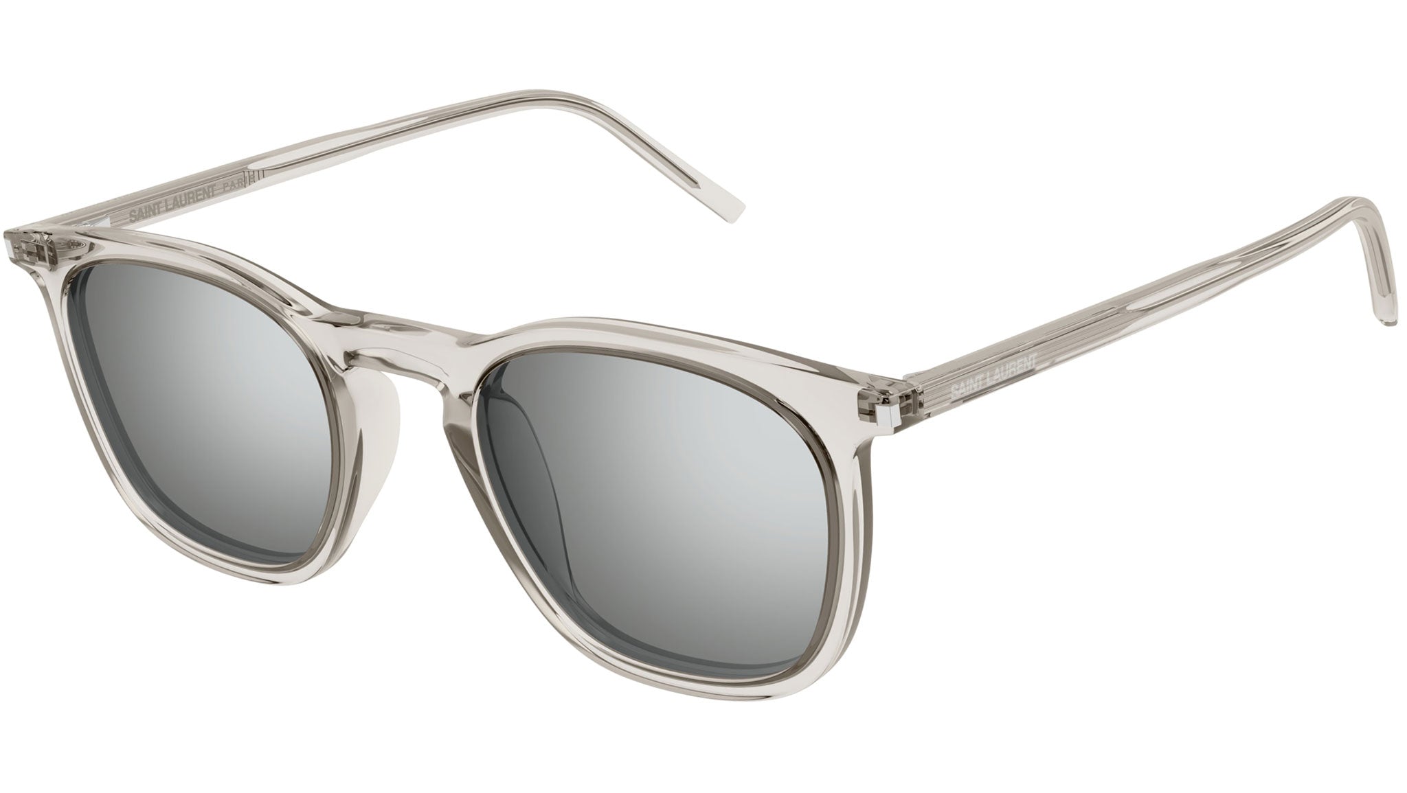 Occhiali da sole Saint Laurent modello SL 623 linea New Wave codice colore 004 crema trasparente lucido in acetato riciclato forma panthos con lenti color argento + grigio tinta unita.