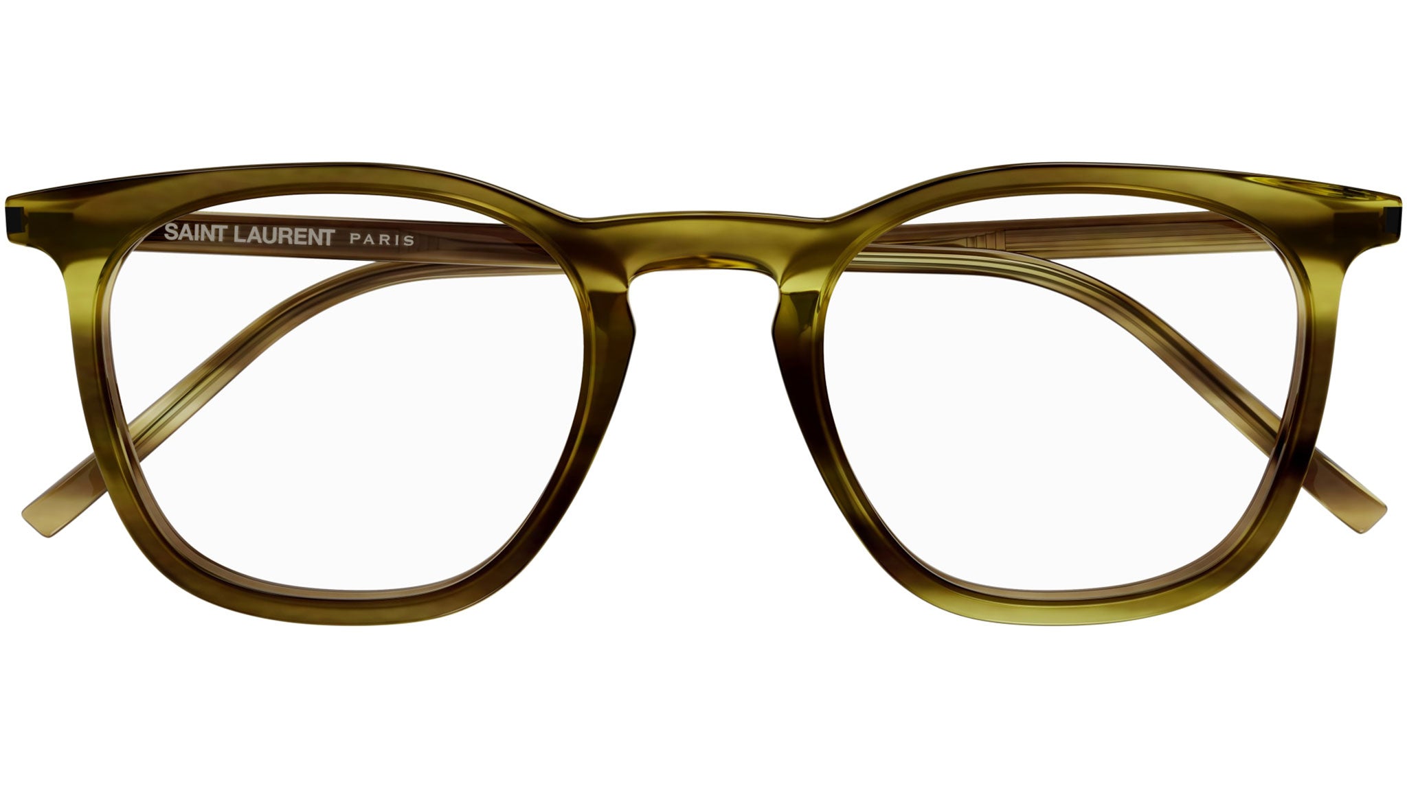 Occhiali da vista Saint Laurent modello SL 623 OPT linea New Wave codice colore 005 kaki melange avana in acetato riciclato forma panthos con aste color tartaruga.