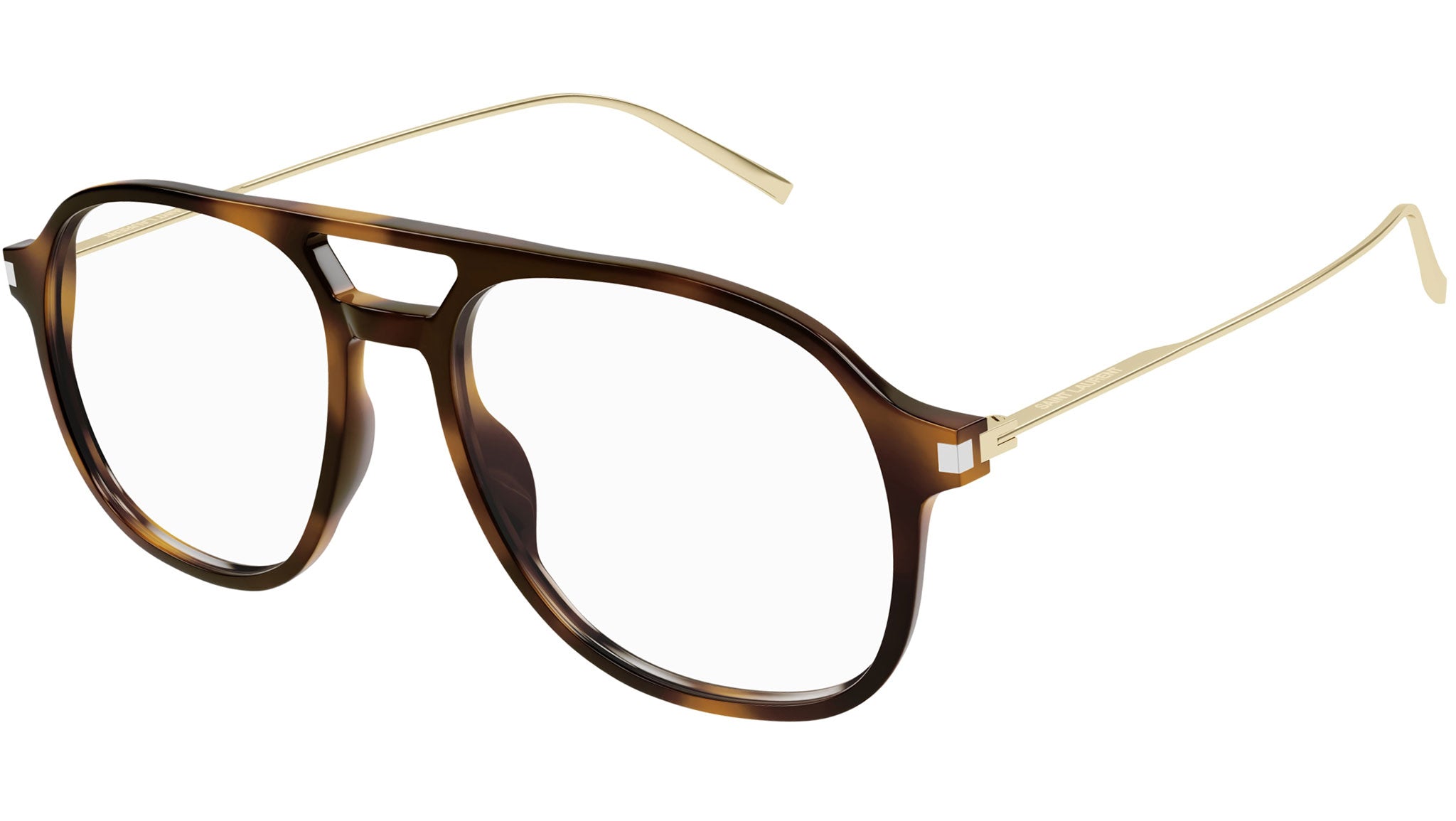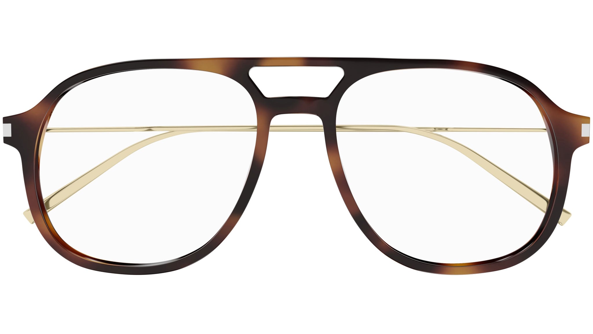 Occhiali da vista Saint Laurent modello SL 626 linea New Wave codice colore 002 avana medio lucido in acetato riciclato forma aviator con aste color oro.