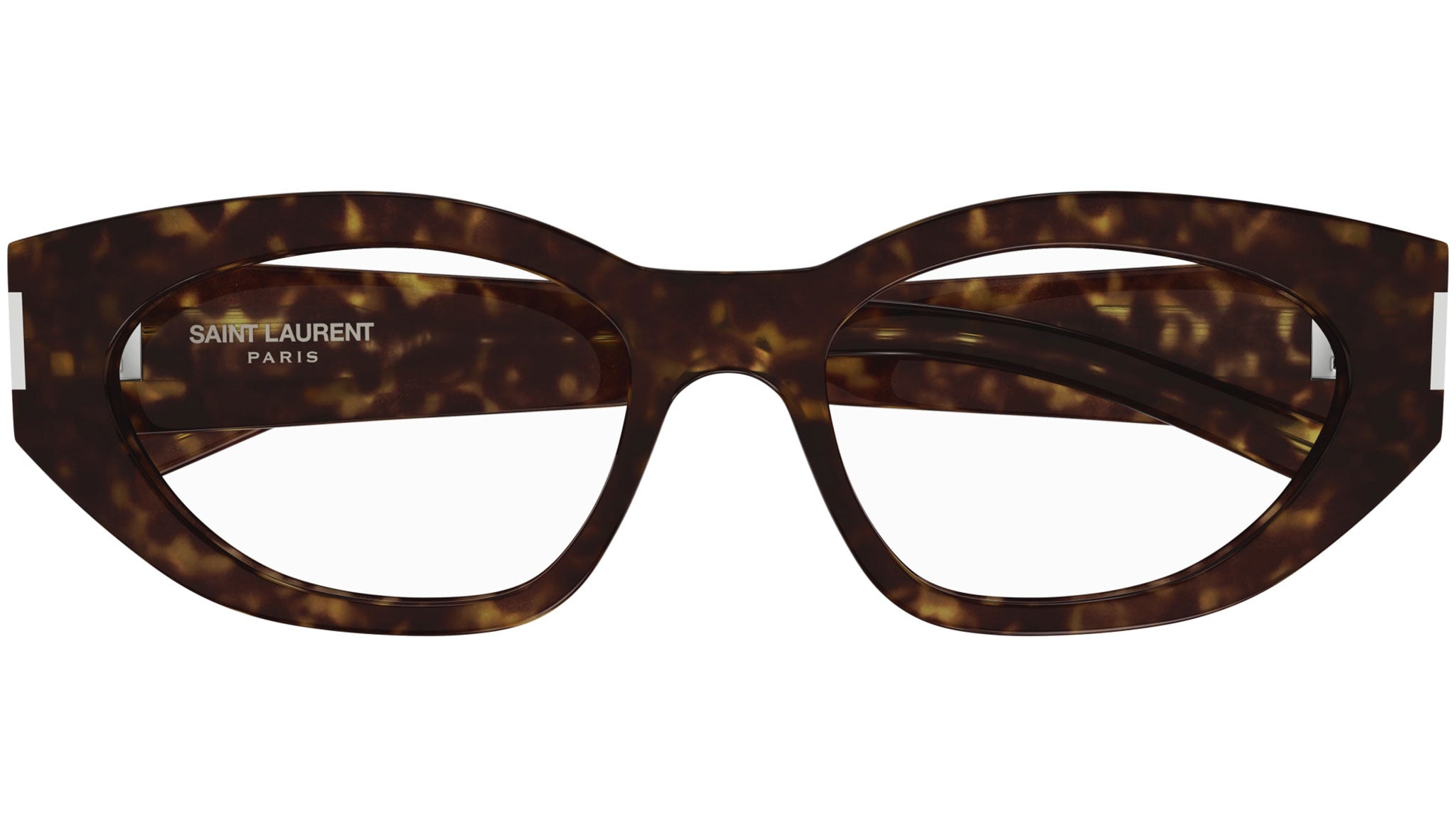 Occhiali da vista Saint Laurent modello SL 638 OPT linea New Wave codice colore 002 tartaruga scuro lucido in acetato riciclato forma cat eye con aste color tartaruga.