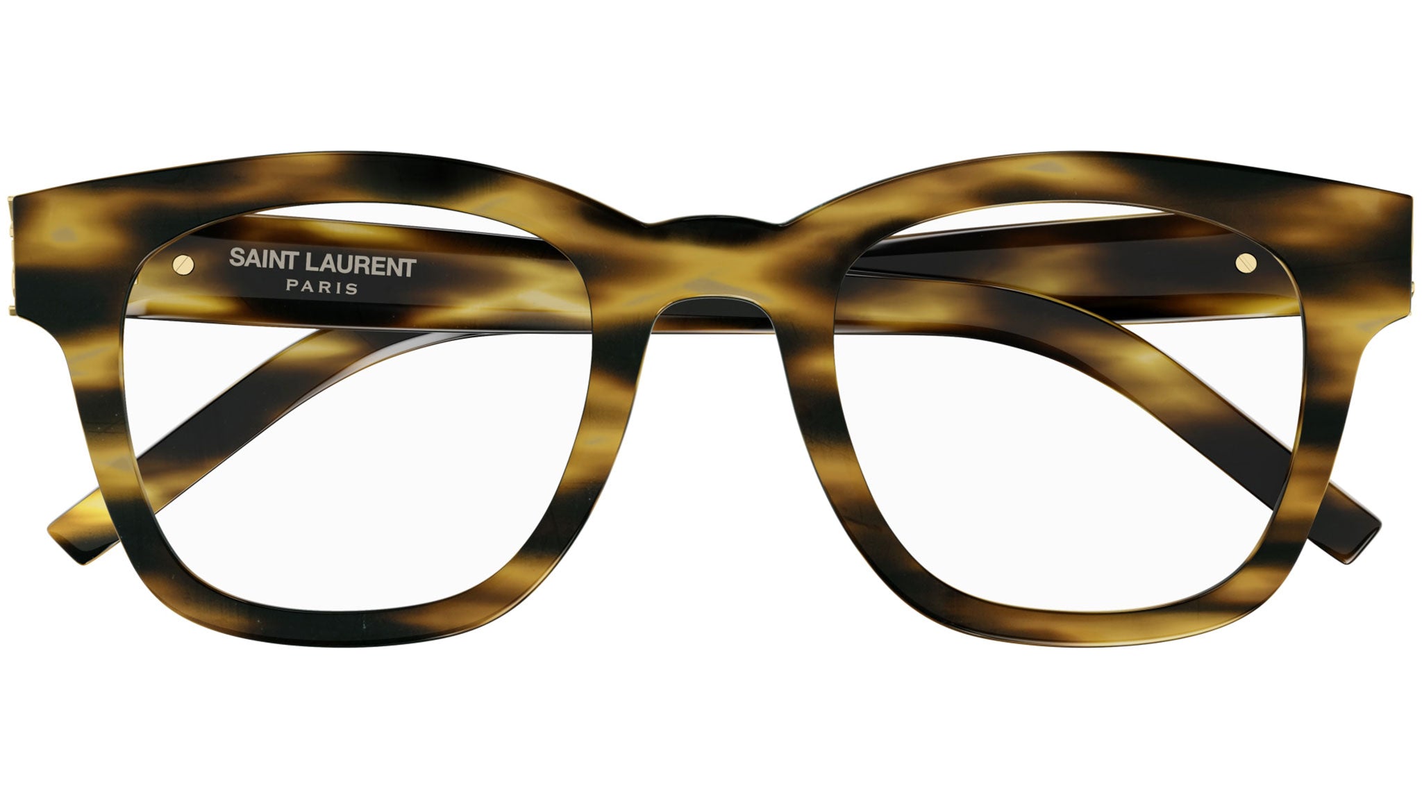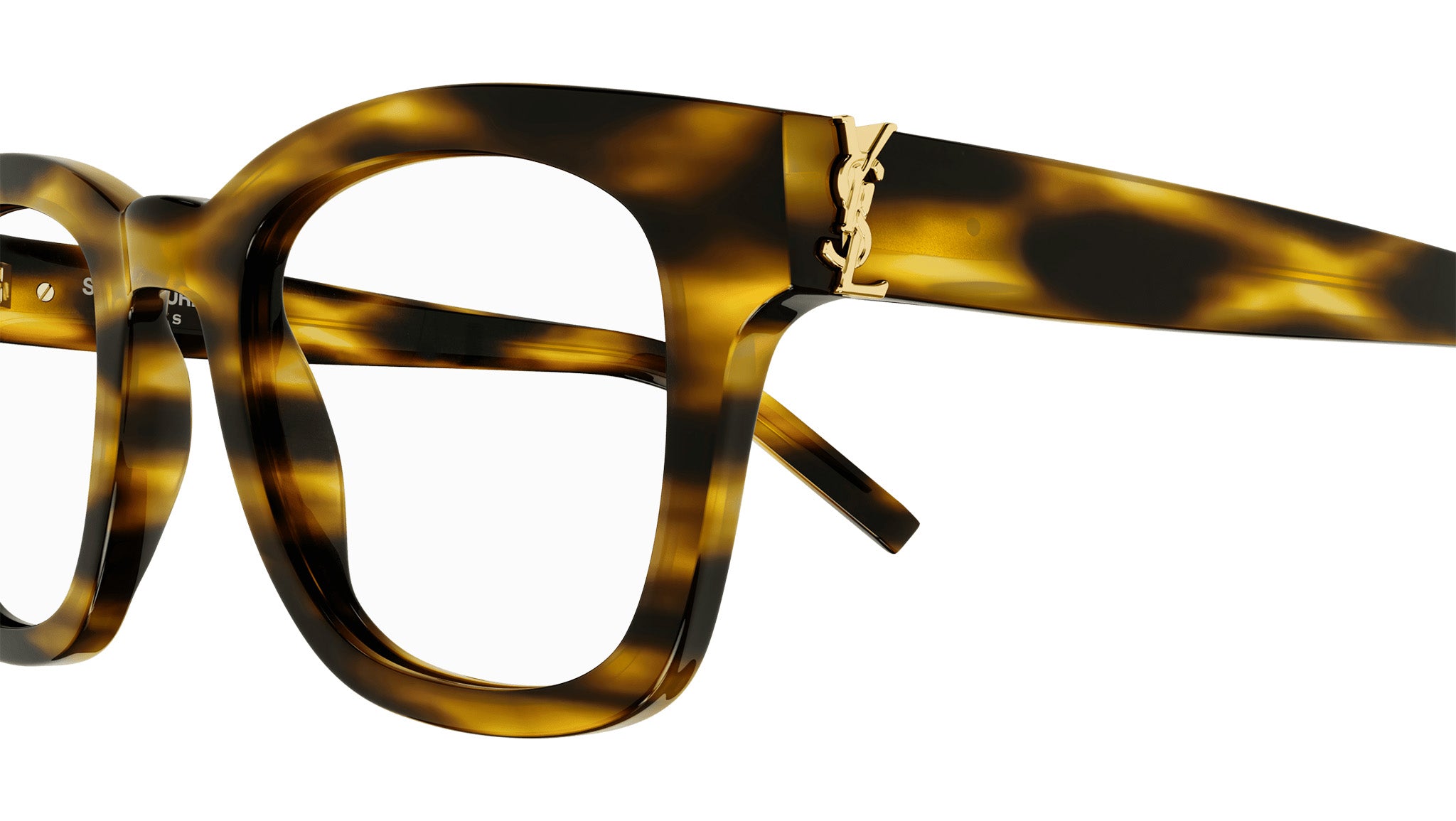Occhiali da vista Saint Laurent modello SL M124 OPT linea Monogram codice colore 003 avana fiammato lucido in acetato riciclato forma rectangle con aste color tartaruga.