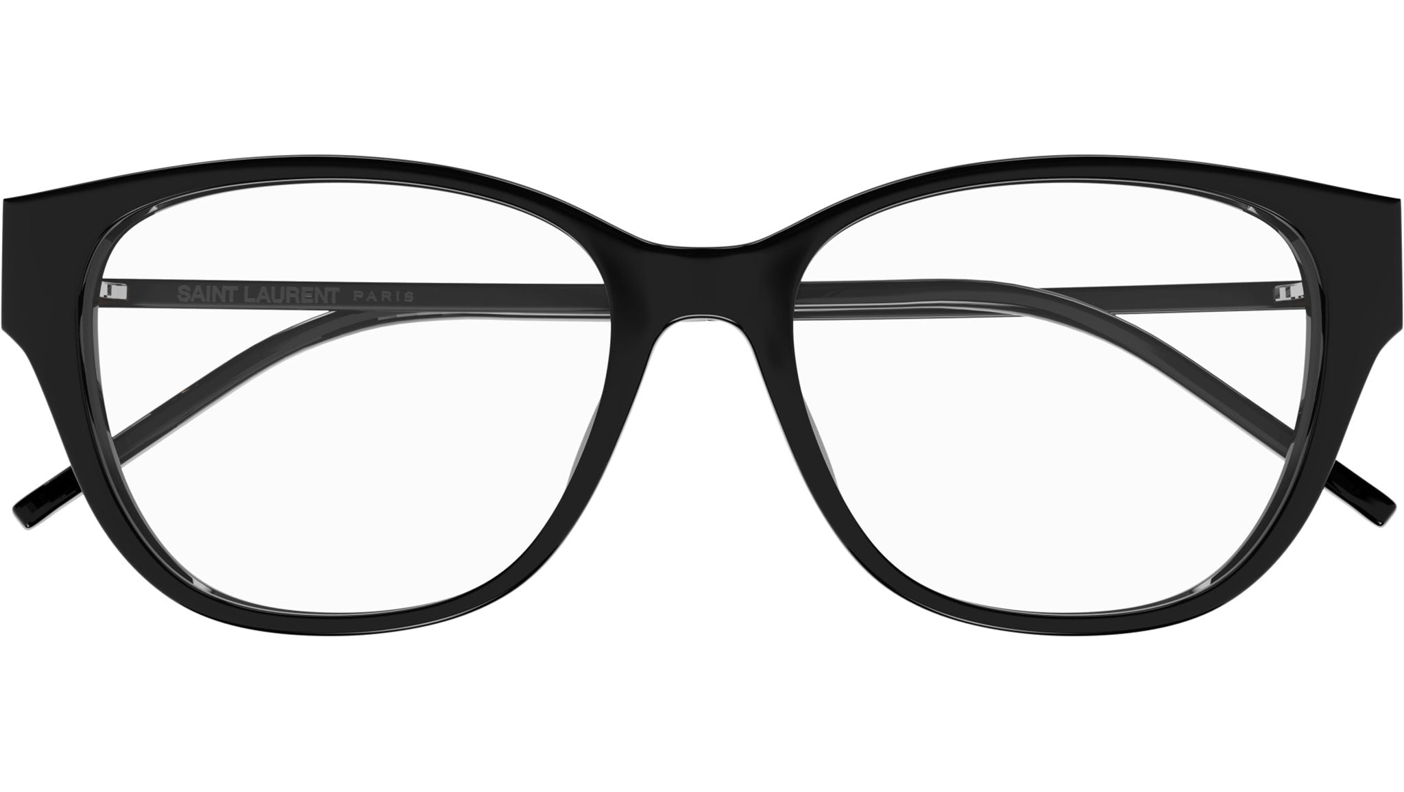 Occhiali da vista Saint Laurent modello SL M48O_C/F linea Monogram codice colore 002 nero lucido in acetato forma cat eye con aste color nero.