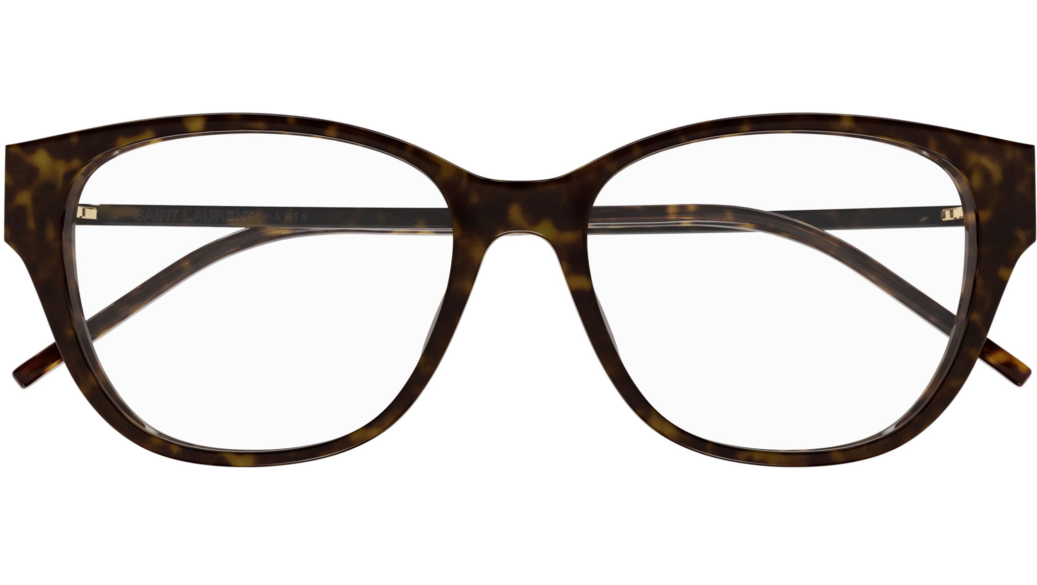Occhiali da vista Saint Laurent modello SL M48O_C/F linea Monogram codice colore 003 tartaruga scuro lucido in acetato forma cat eye con aste color oro.
