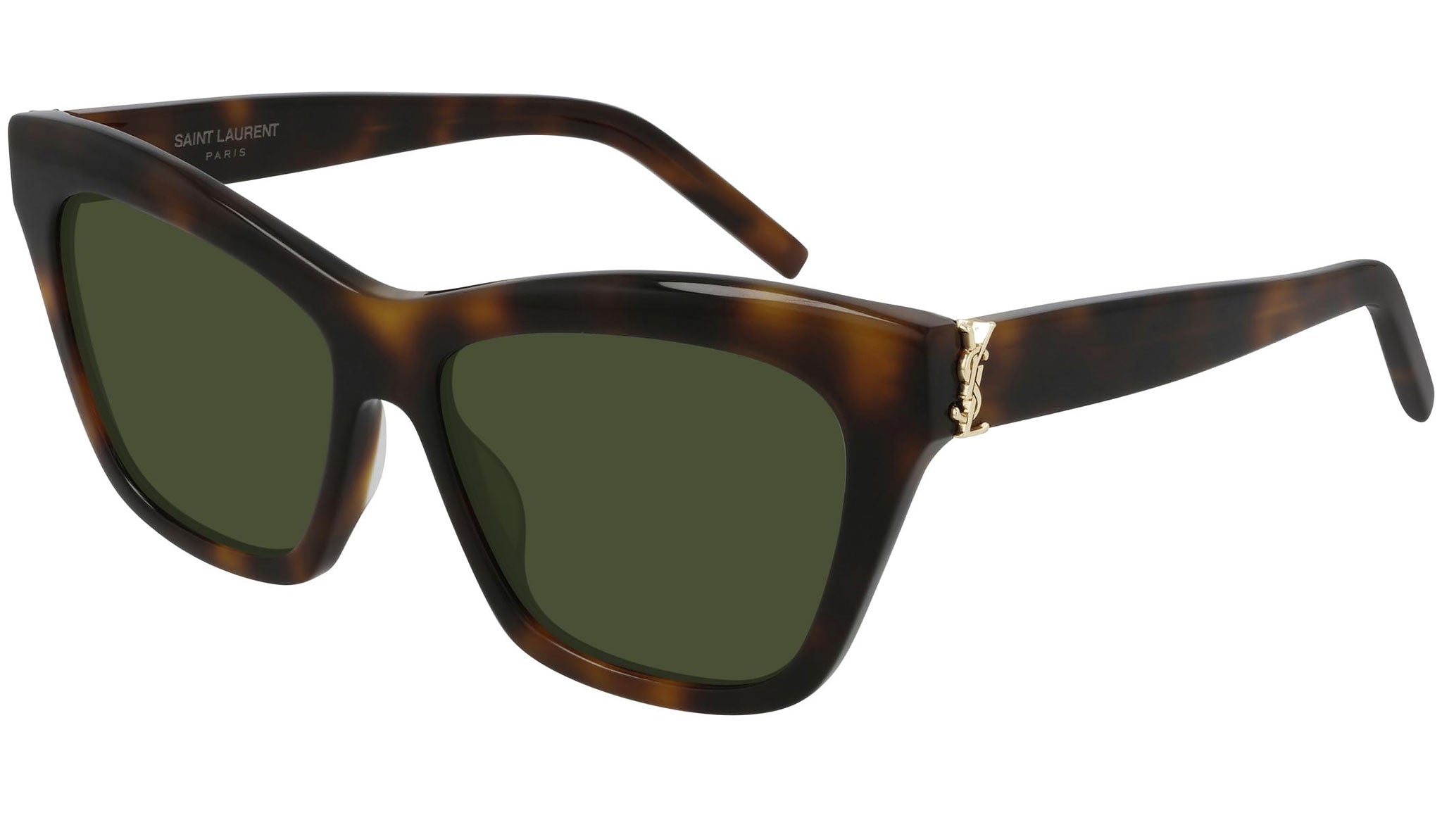 Occhiali da sole linea Monogram modello SL M79 002, variante colore avana medio lucido con lenti color verde tinta unita. Saint Laurent Eyewear rappresenta in pieno le attitudini uniche del brand: stile senza tempo coniugato a un moderno concetto di lusso. La collezione sole offre una raffinata selezione di prodotti unici, contraddistinti da una qualità inarrivabile.